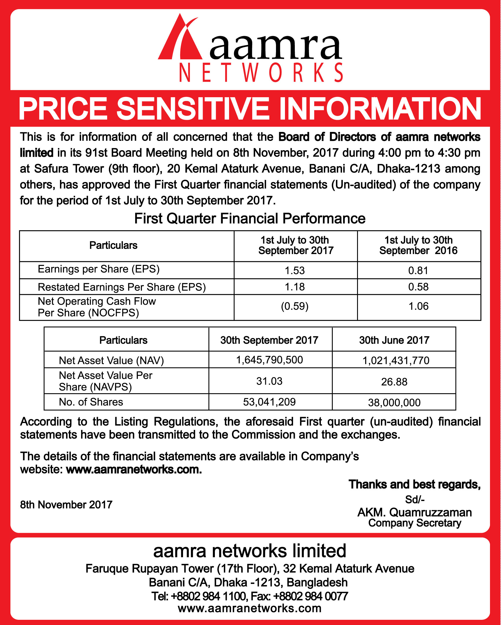 Disclosure of Price Sensitive Information of Aamra Networks Limited