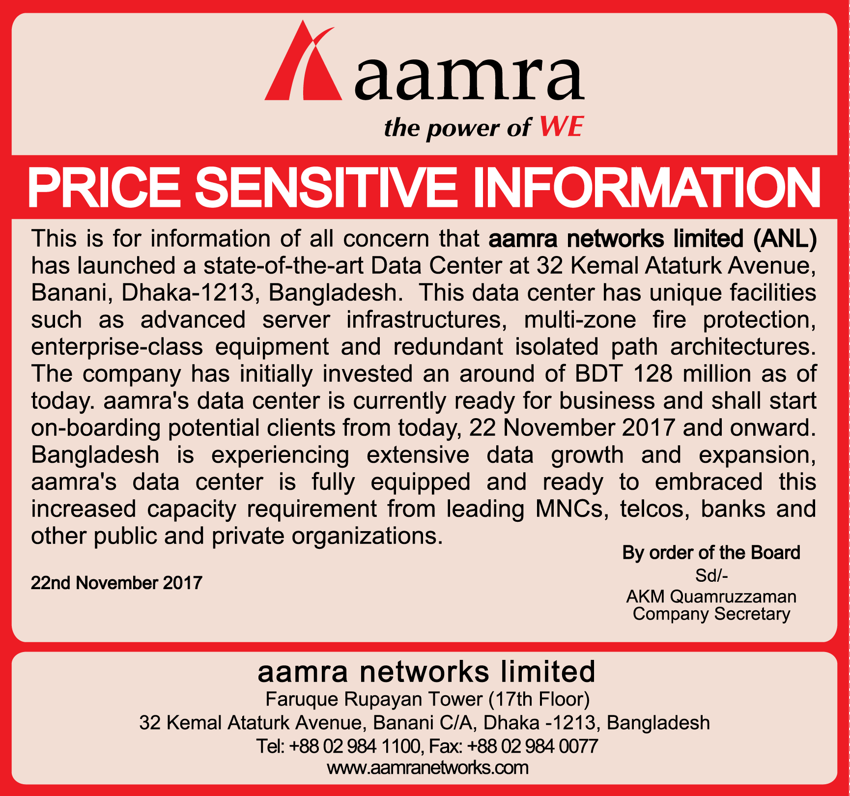 Aamra Networks Limited Price Sensitive Information
