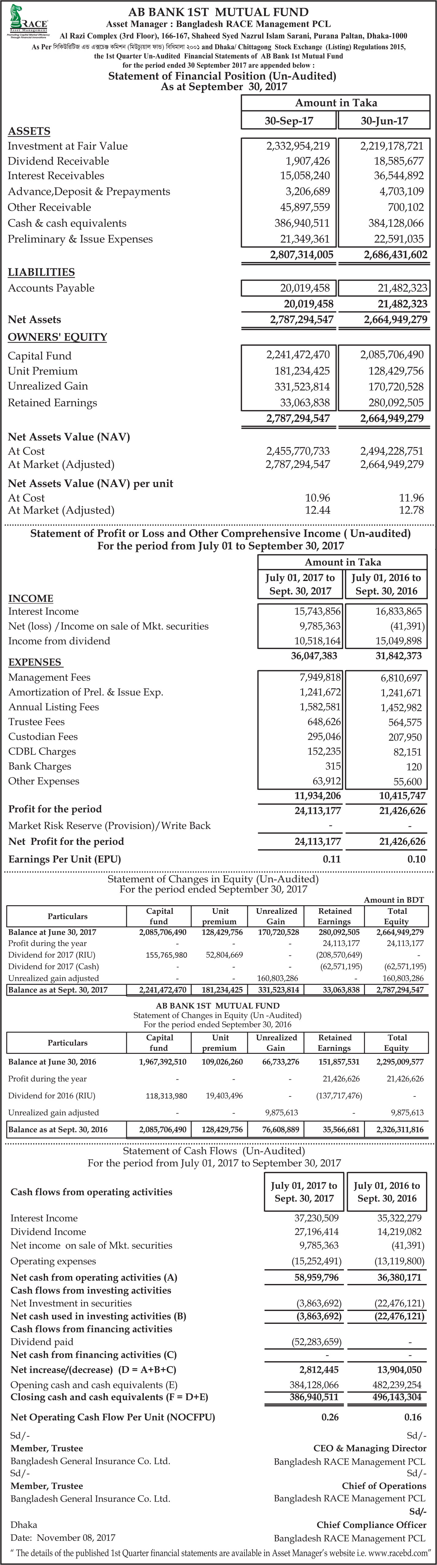 Un-audited Statements of Financial Position of AB Bank 1st Mutual fund