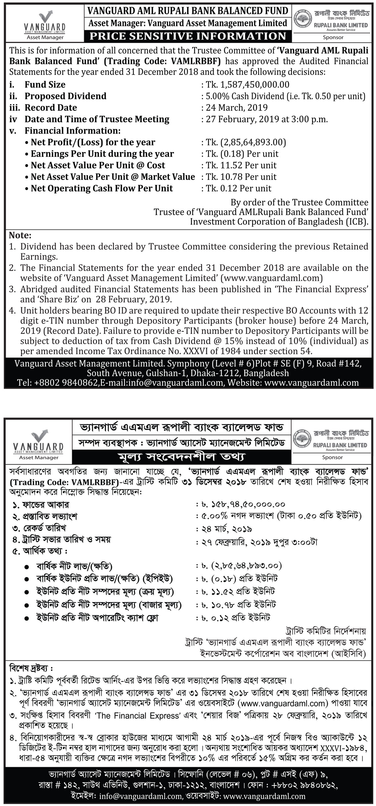 Price Sensitive Information of Vanguard AML Rupali Bank Balanced Fund