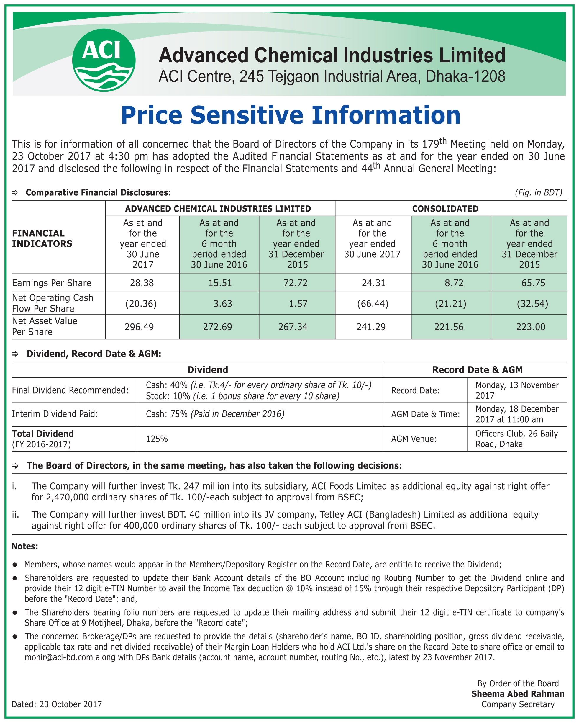 Price Sensitive Information of ACI Limited