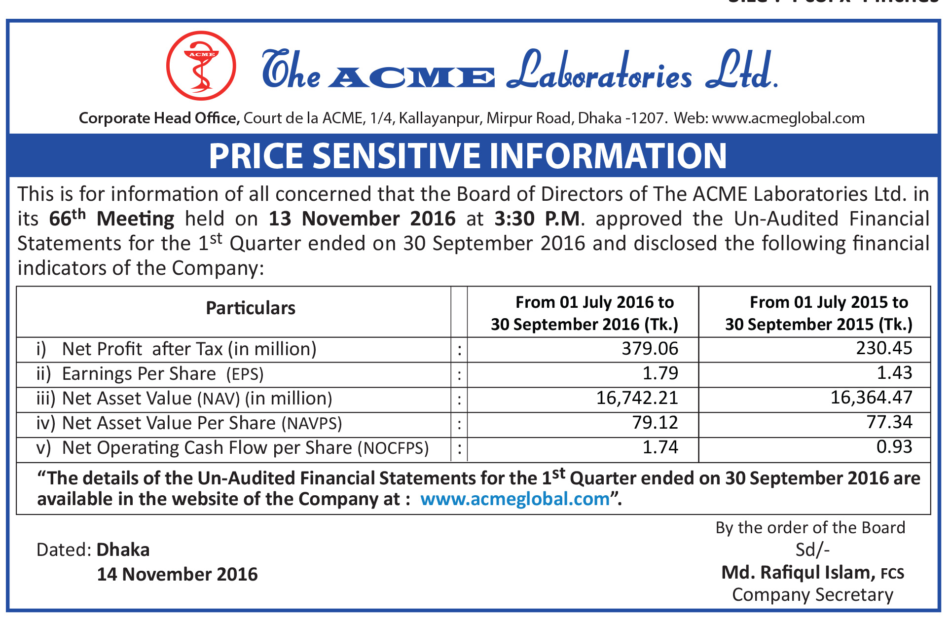 ACME Laboratories Ltd. 1Q Price Sensitive Information