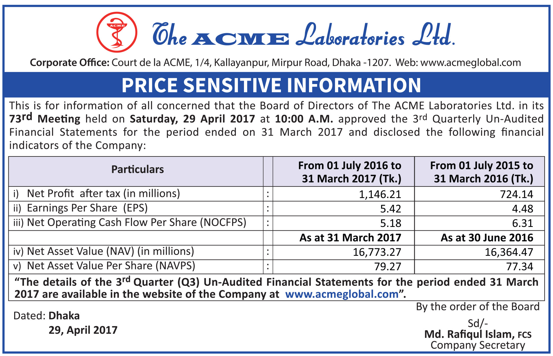 ACME Laboratories Ltd. 1Q Price Sensitive Information