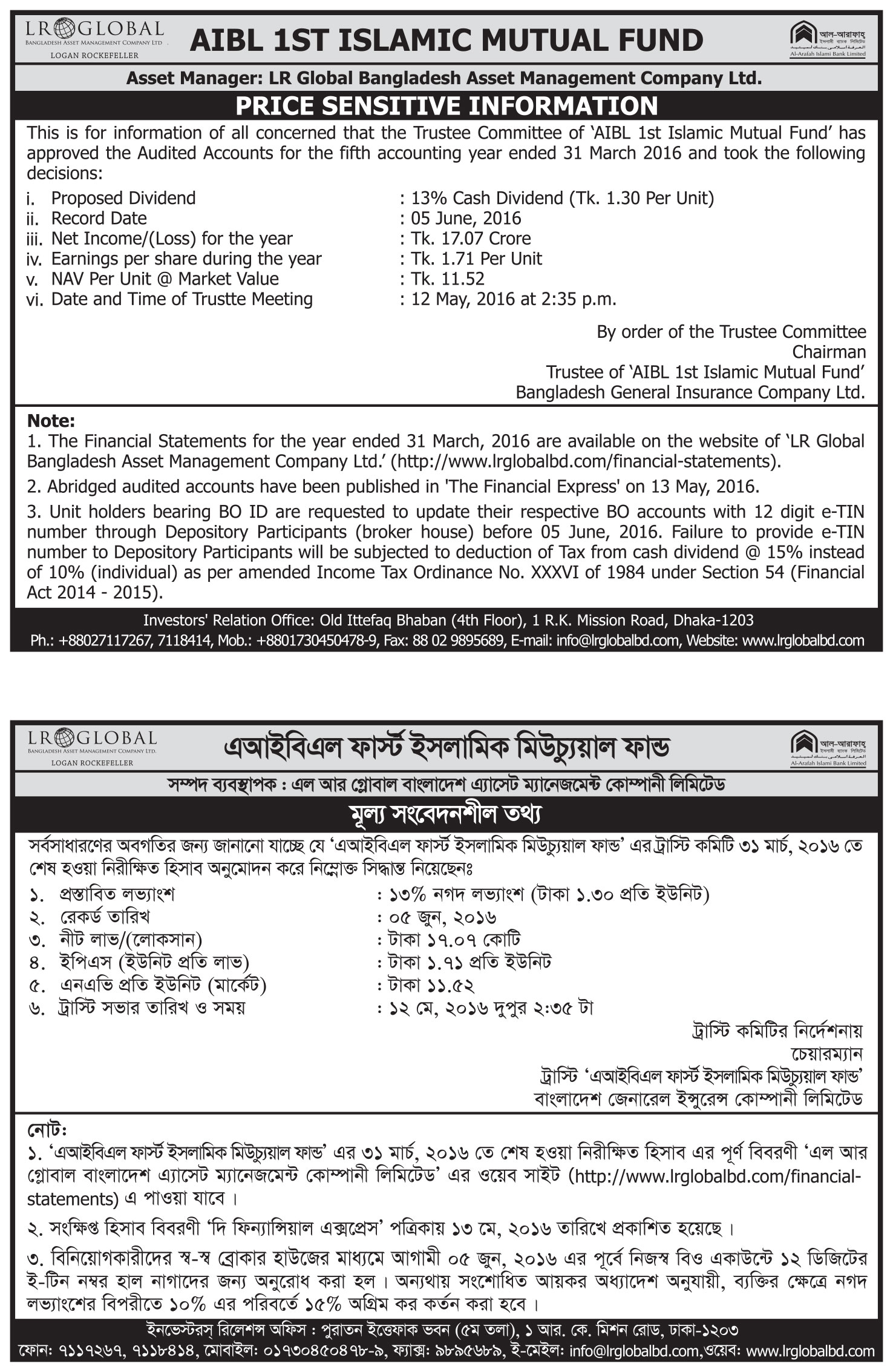 AIBL 1st Islamic Mutual Fund Price Sensitive Information