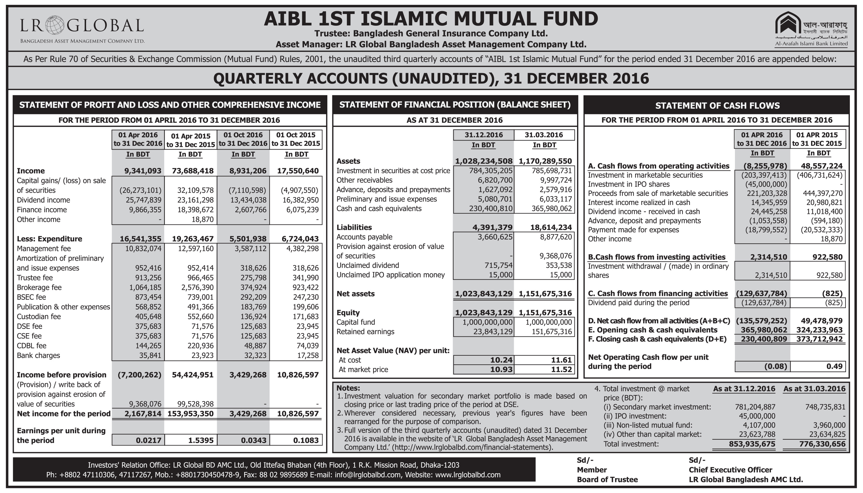 AIBL 1st Islamic Mutual Fund Quarterly Accounts December 2016