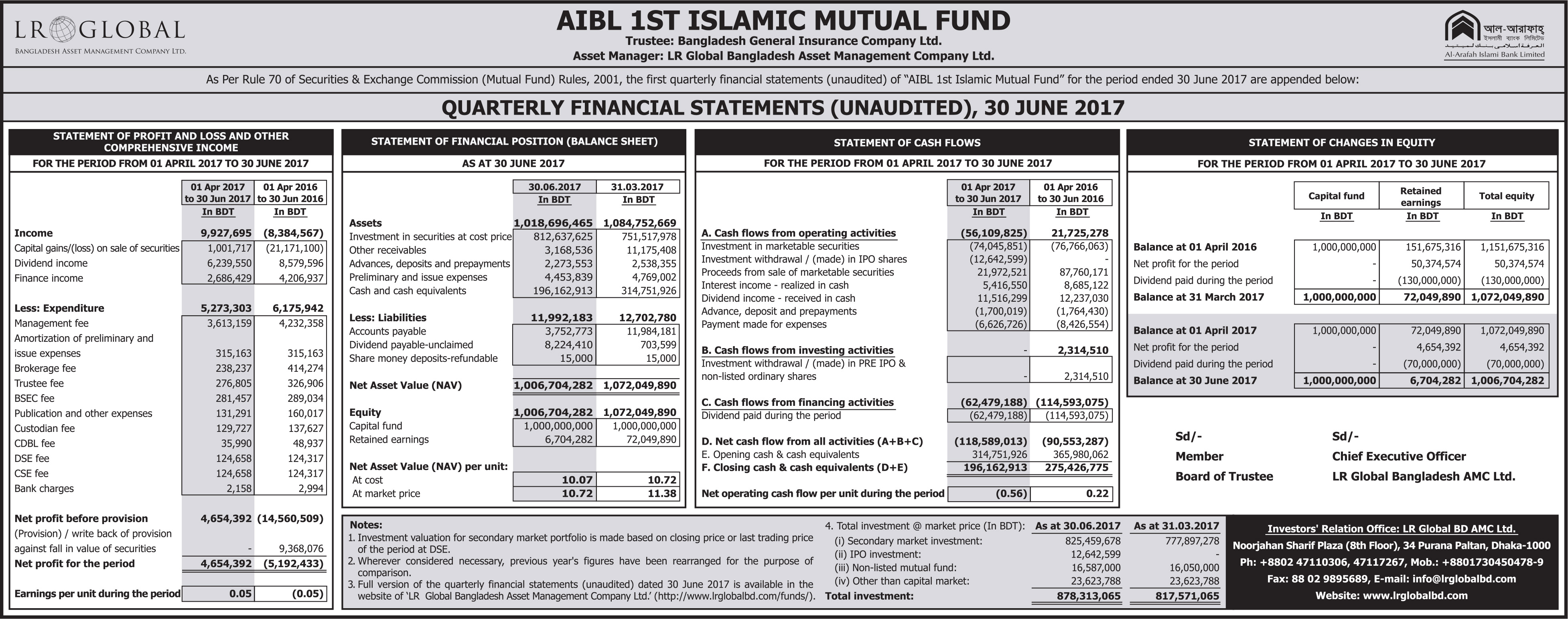 Quarterly Financial Statements (Unaudited) of AIBL 1st Islamic Mutual Fund