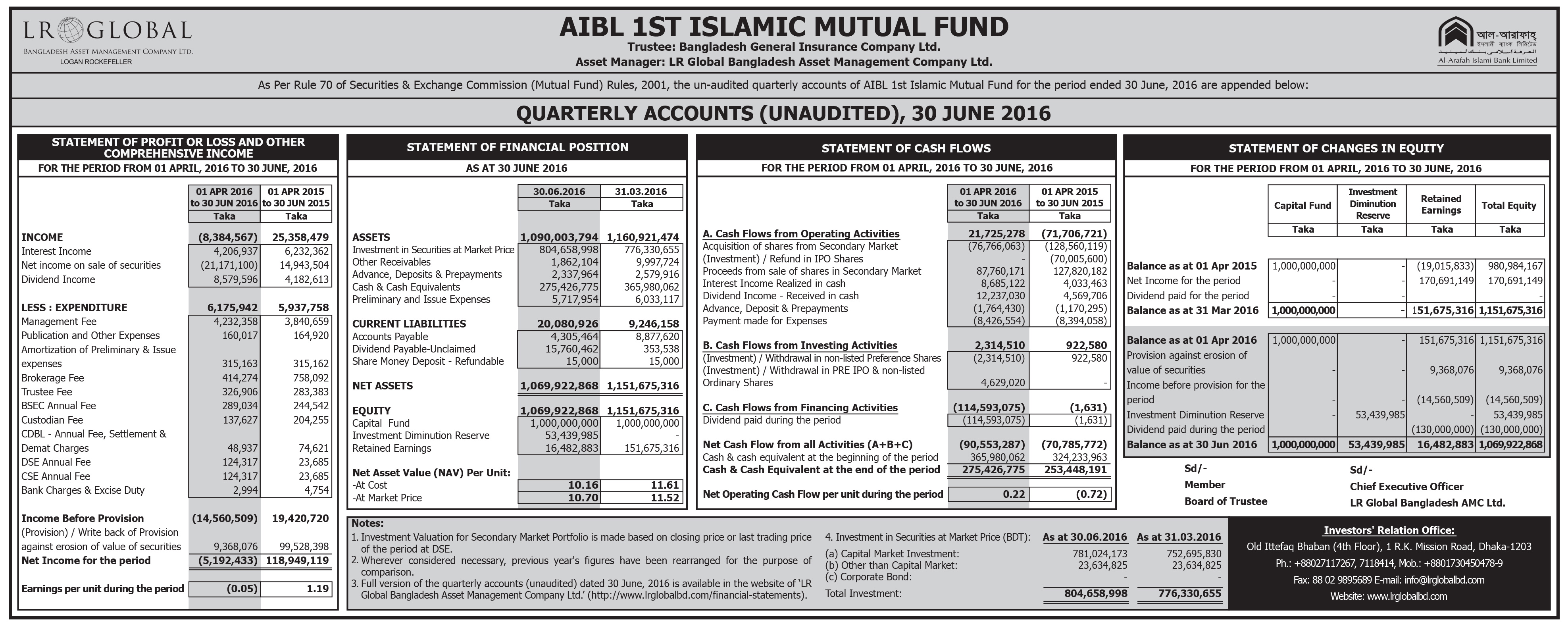 Quarterly Financial Statements (Unaudited) of AIBL 1st Islamic Mutual Fund