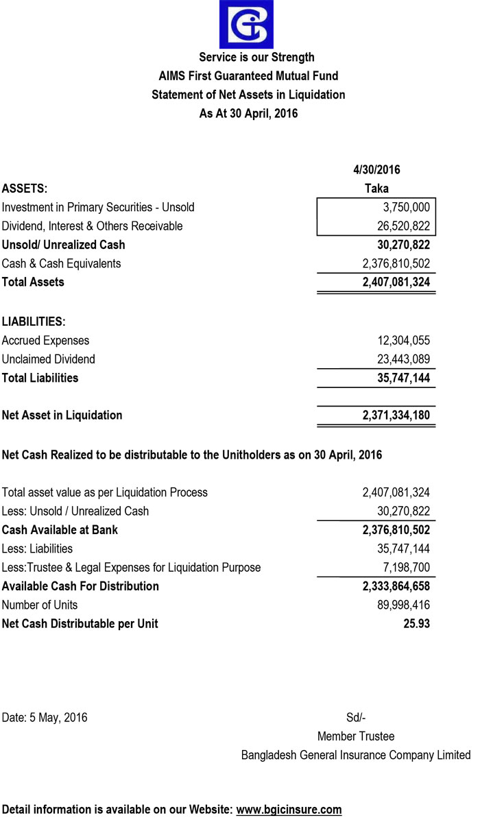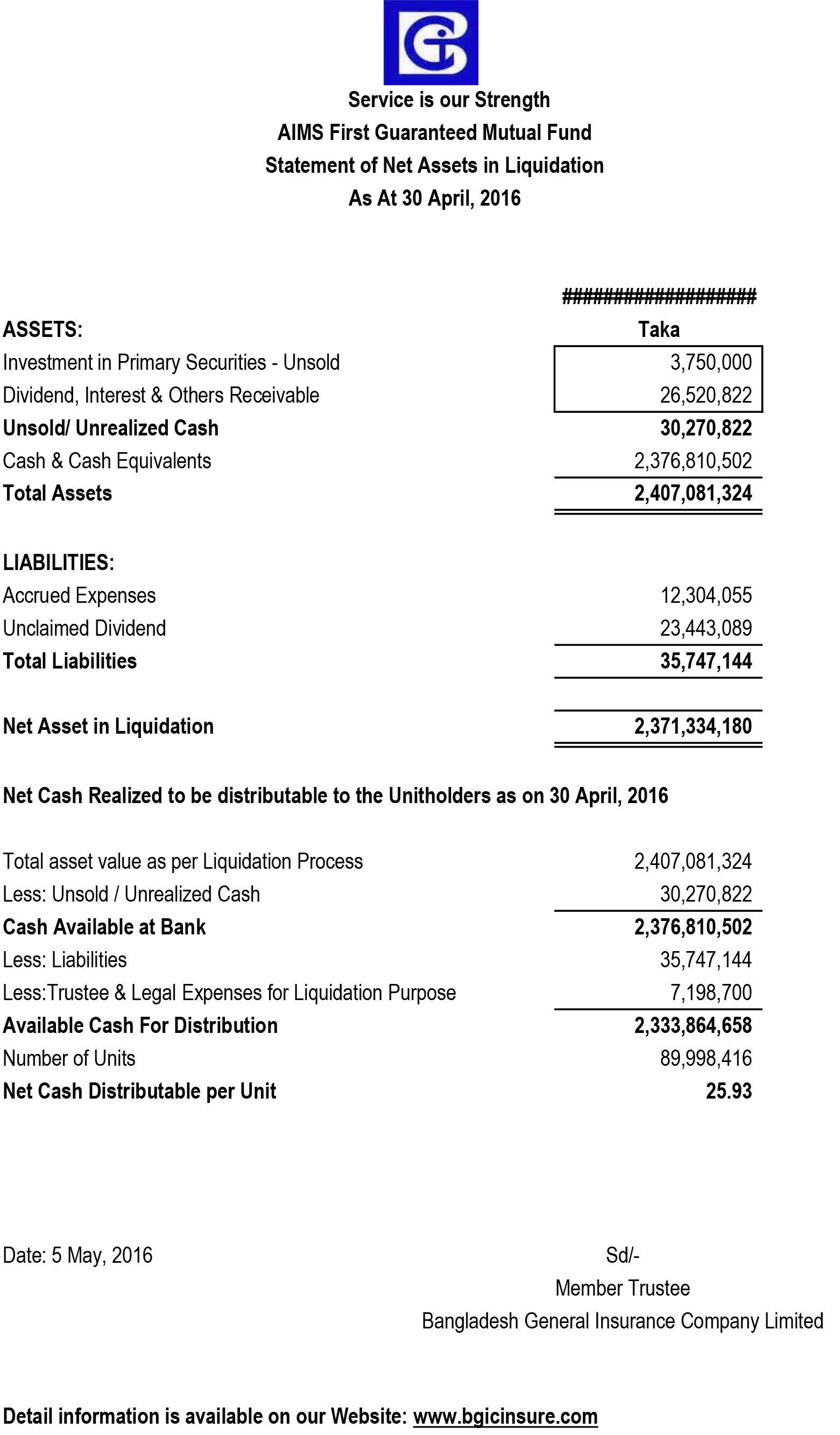 AIMS First Guaranteed Mutual Fund Price Sensitive Information
