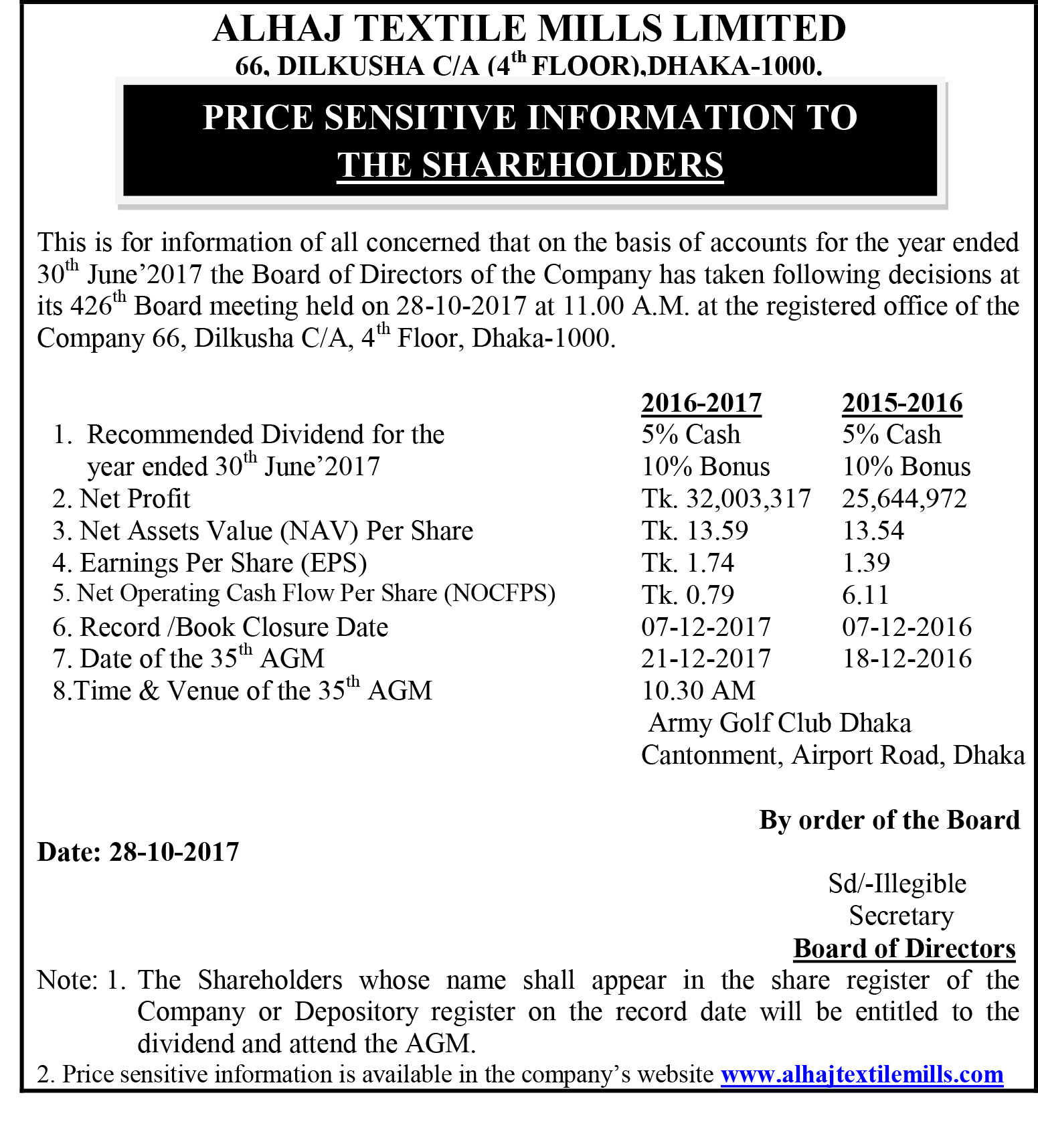 Price Sensitive Information of Alhaj Textile Mills Ltd