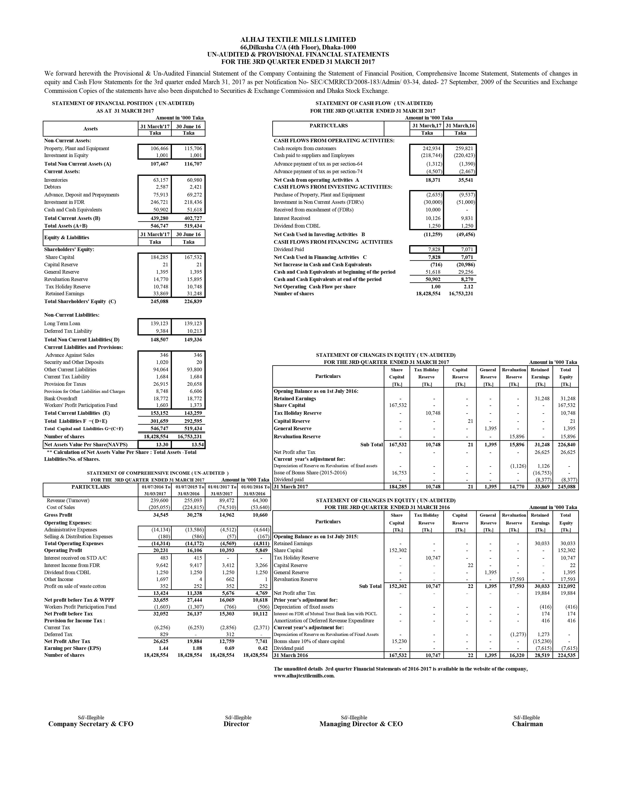 Q3 Un-Audited & Provisional Financial Statements of Alhaj Textile Mills Ltd