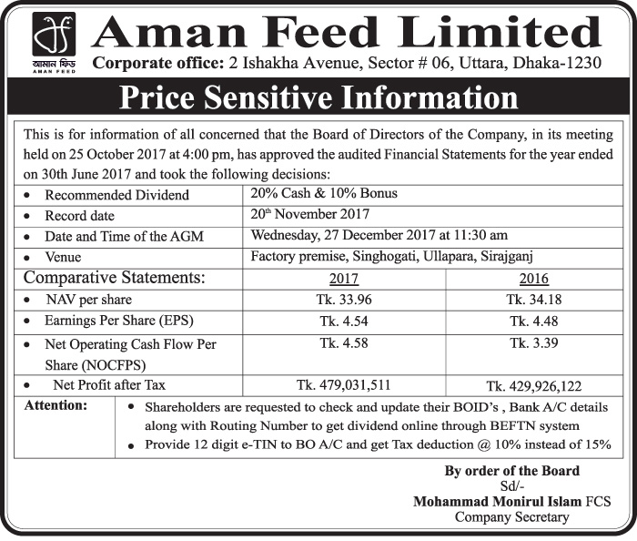 Price Sensitive Information of Aman Feed Limited