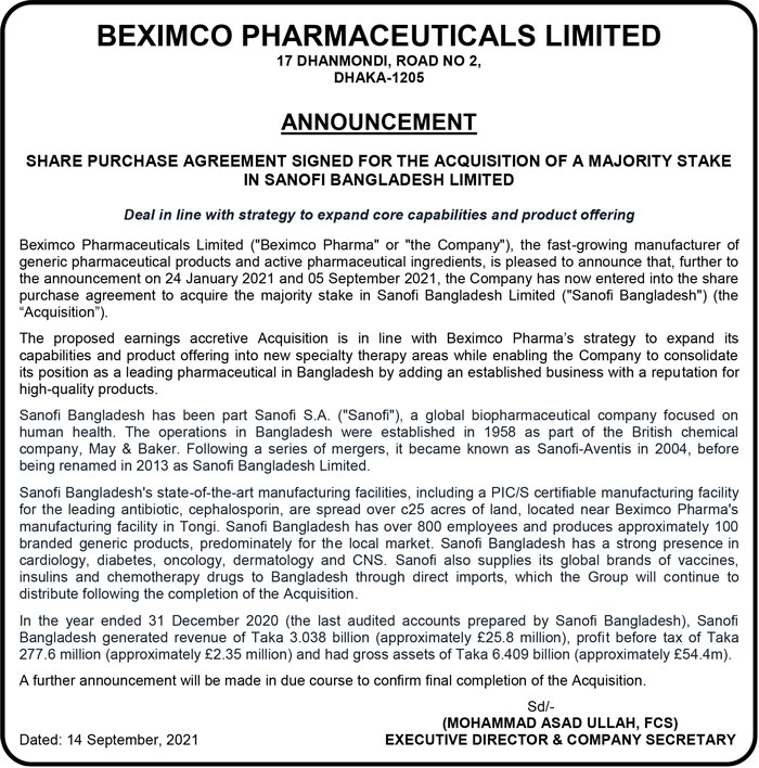 Price Sensitive Information of Beximco Pharmaceuticals Ltd.