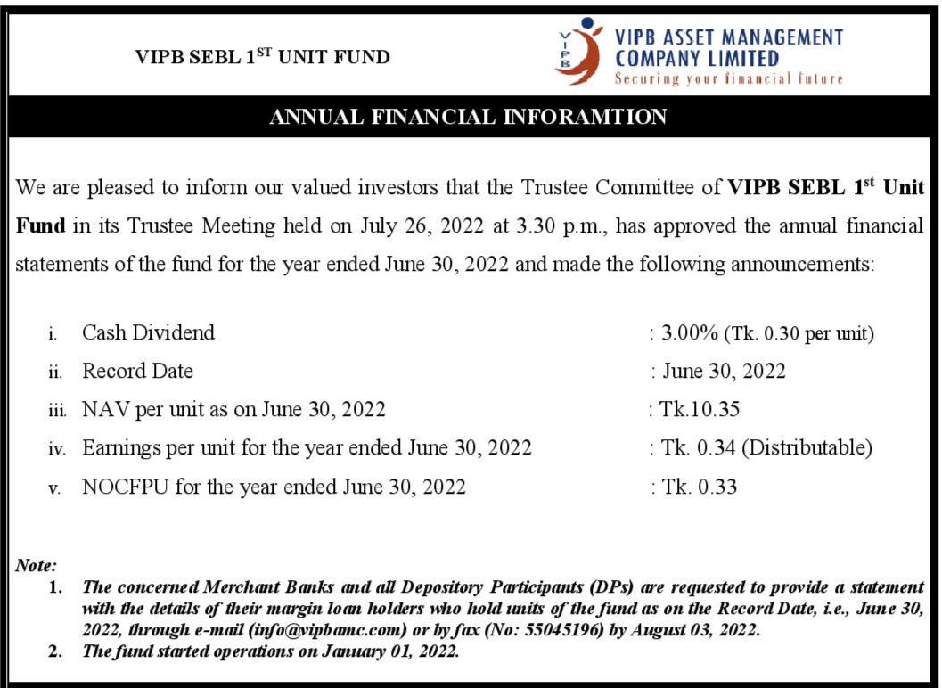 Annual Financial Information VIPB SEBL 1st Unit Fund