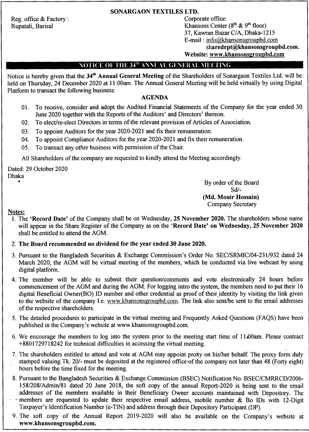 Annual General Meeting of Sonargaon Textiles Ltd.