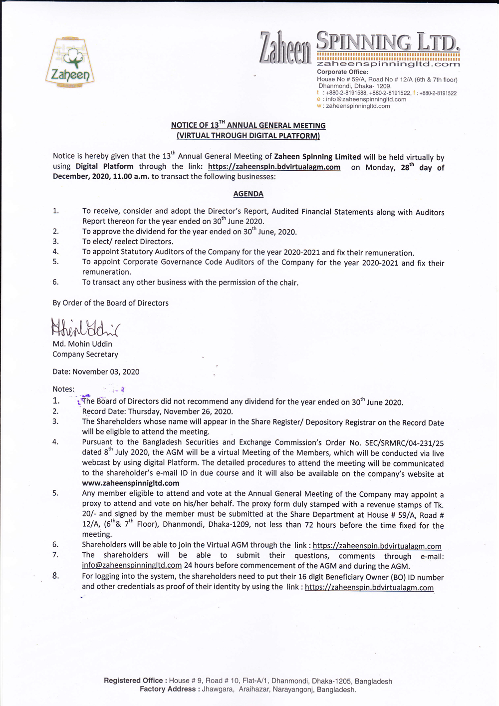 Notice of the 17th AGM of Zaheen Spinning Limited