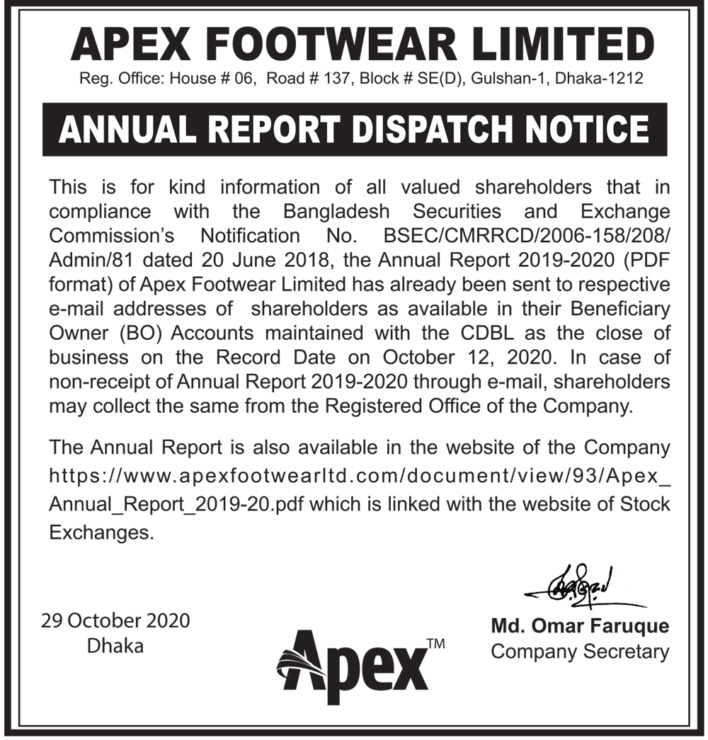 Annual Report Dispatch Notice of Apex Footwear Limited