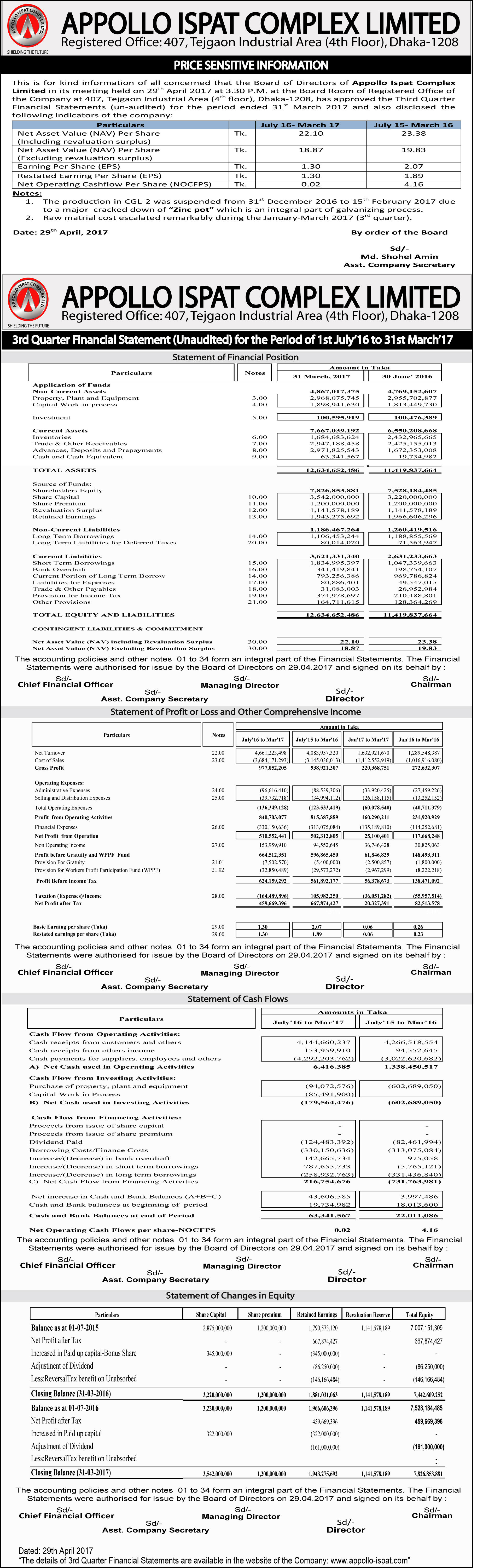 Appollo Ispat Complex Limited 3Q Financial Statements