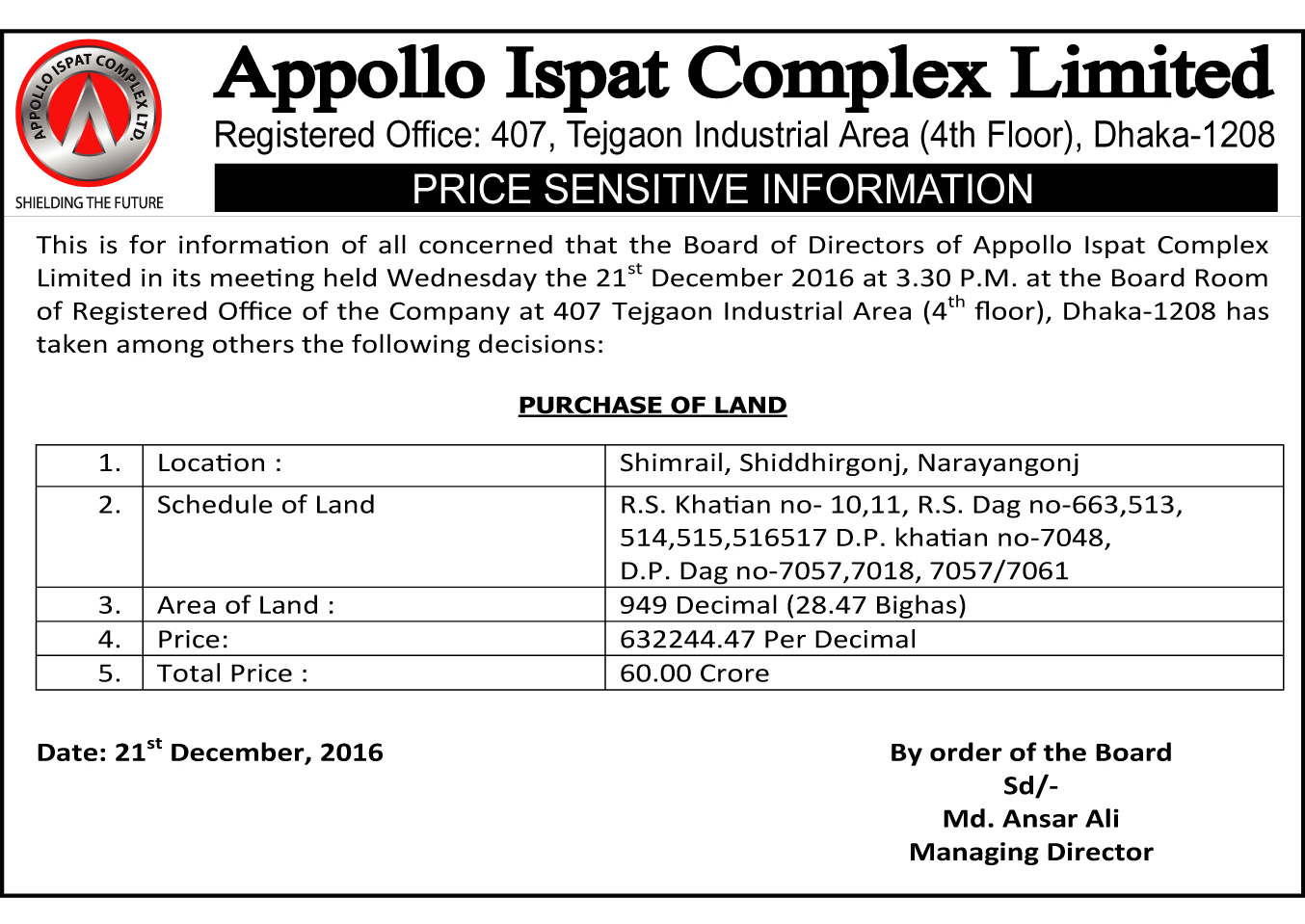 Price Sensitive Information of Appollo Ispat Complex Limited