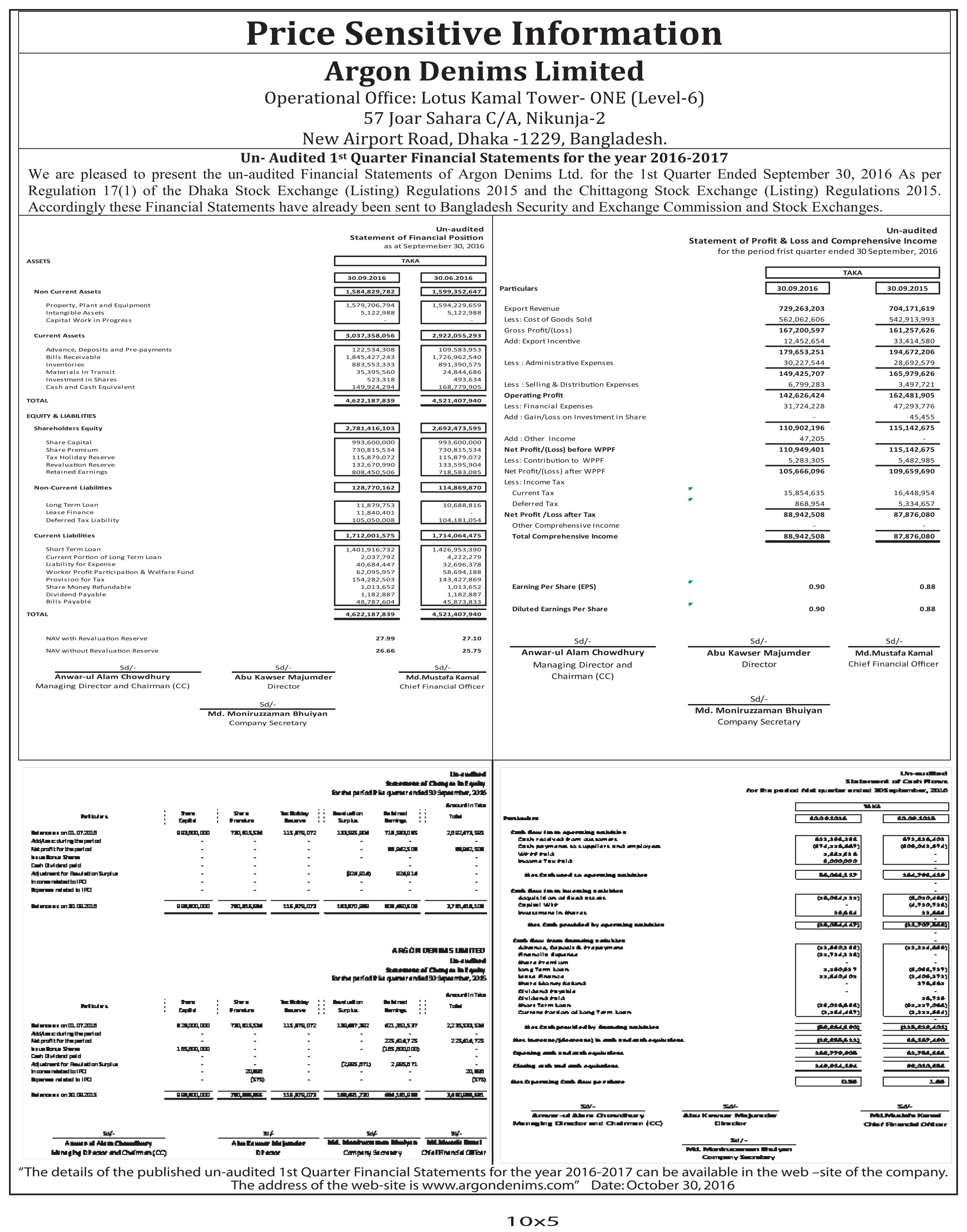 Q2 Un-audited Financial Statements of Argon Denims Limited