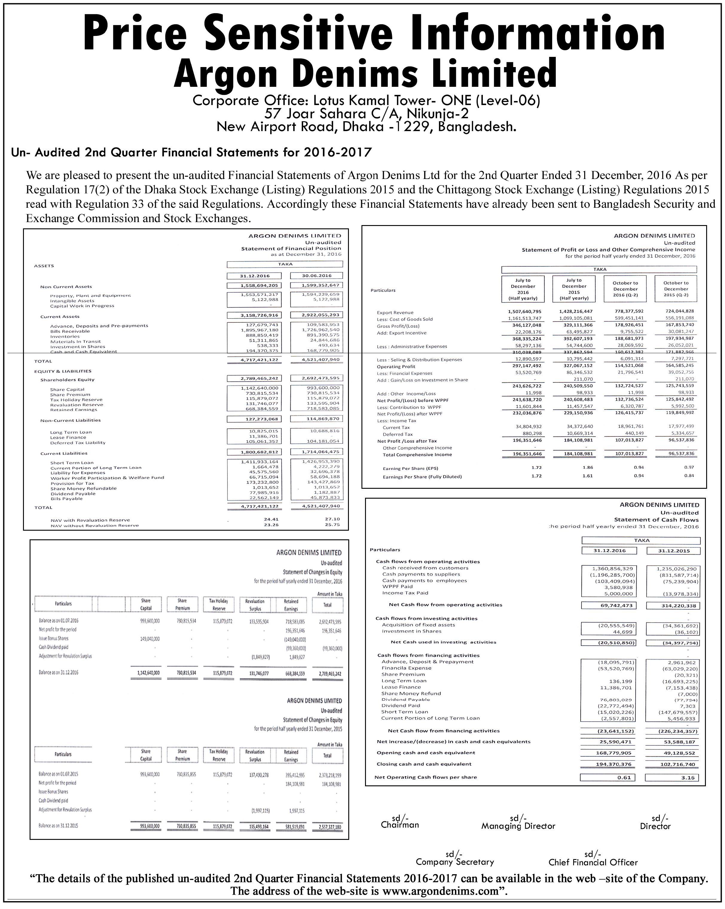 Argon Denims Limited Un-Audited 2nd Querter Financial Statements for 2016-2017