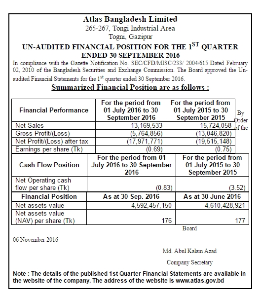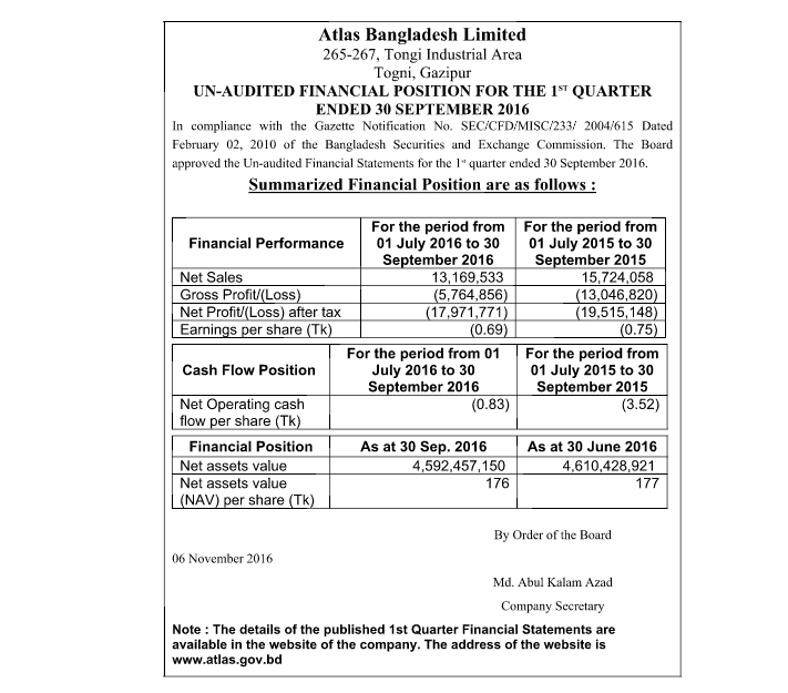Atlas Bangladesh 1Q UN-AUDITED FINANCIAL POSITION
