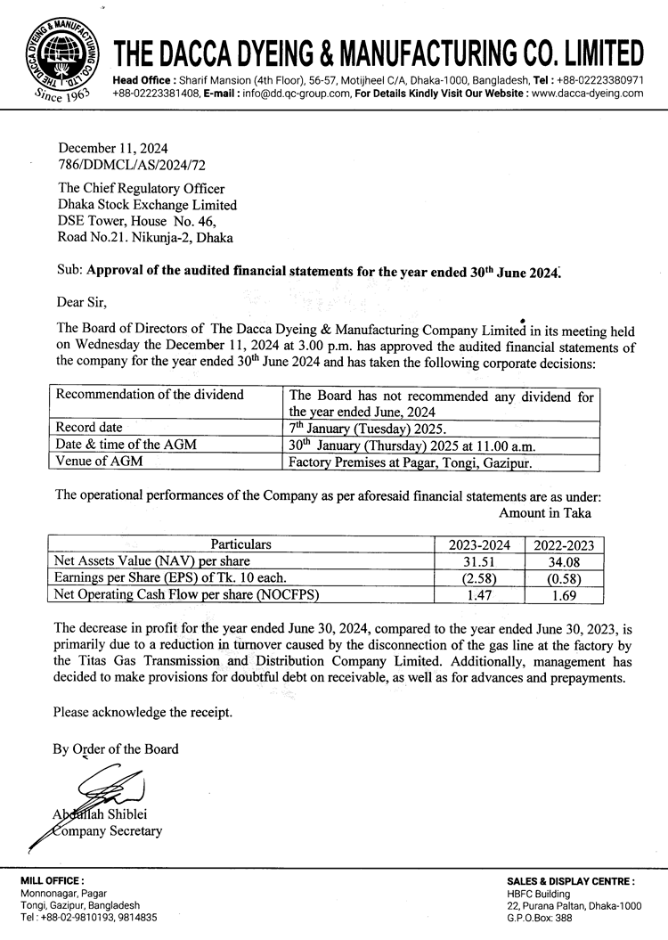Audited Financial Statements of The Dacca Dyeing & Manufacturing Co. Ltd