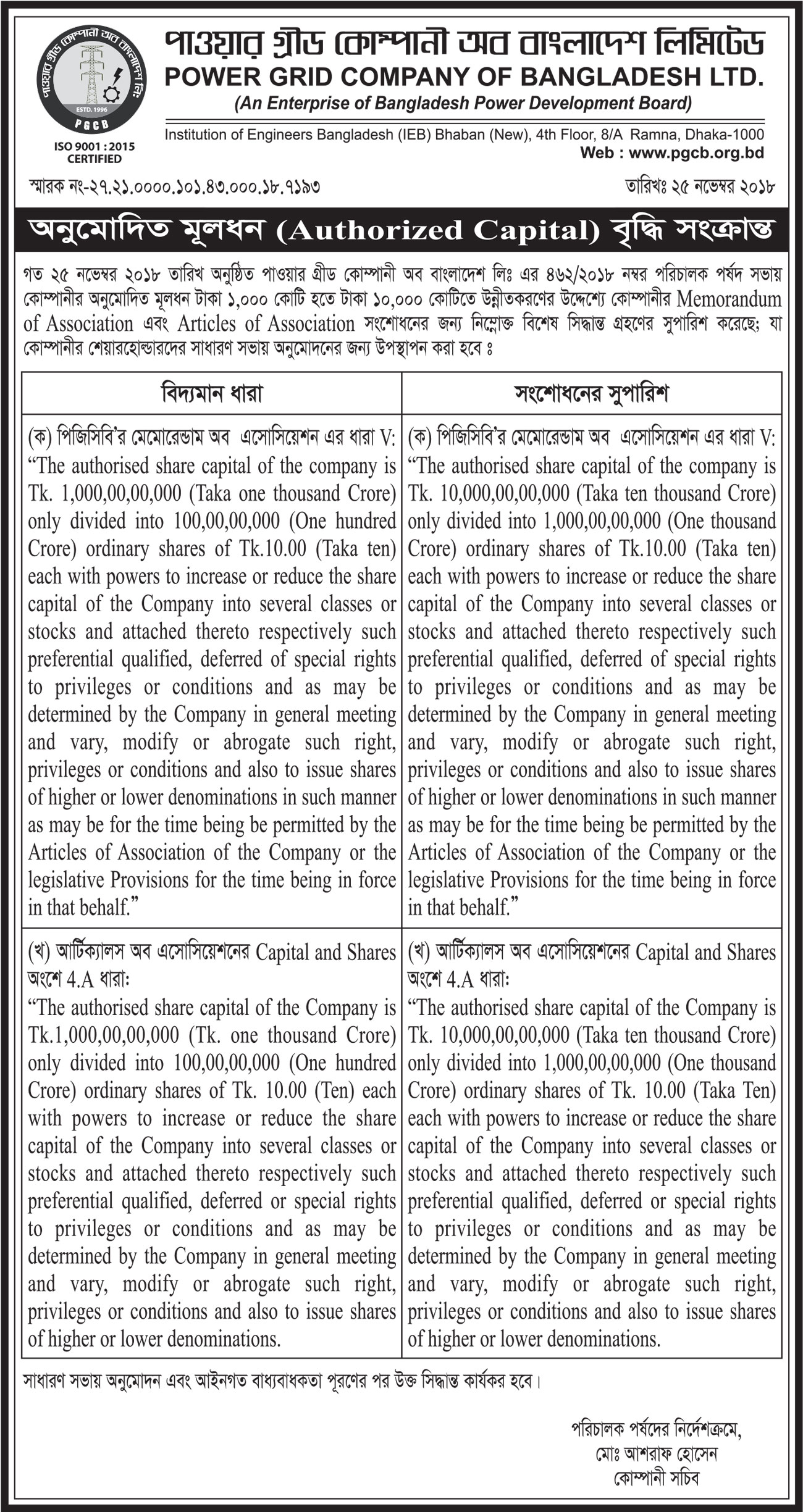 Authorized Capital of Power Grid Company of Bangladesh Ltd.