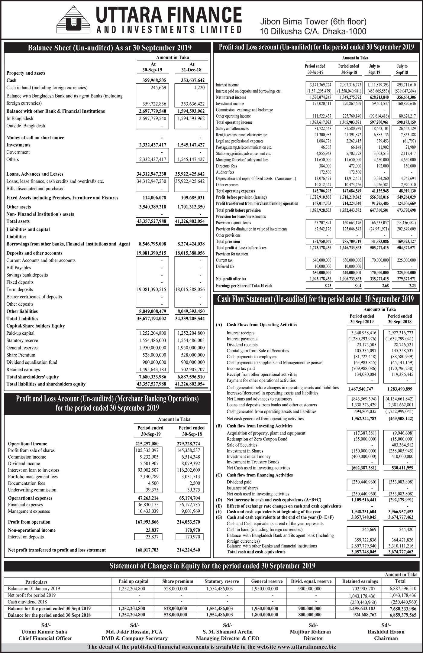Q3 Un-audited Financial Statements ofUttara Finance and Investments Limited