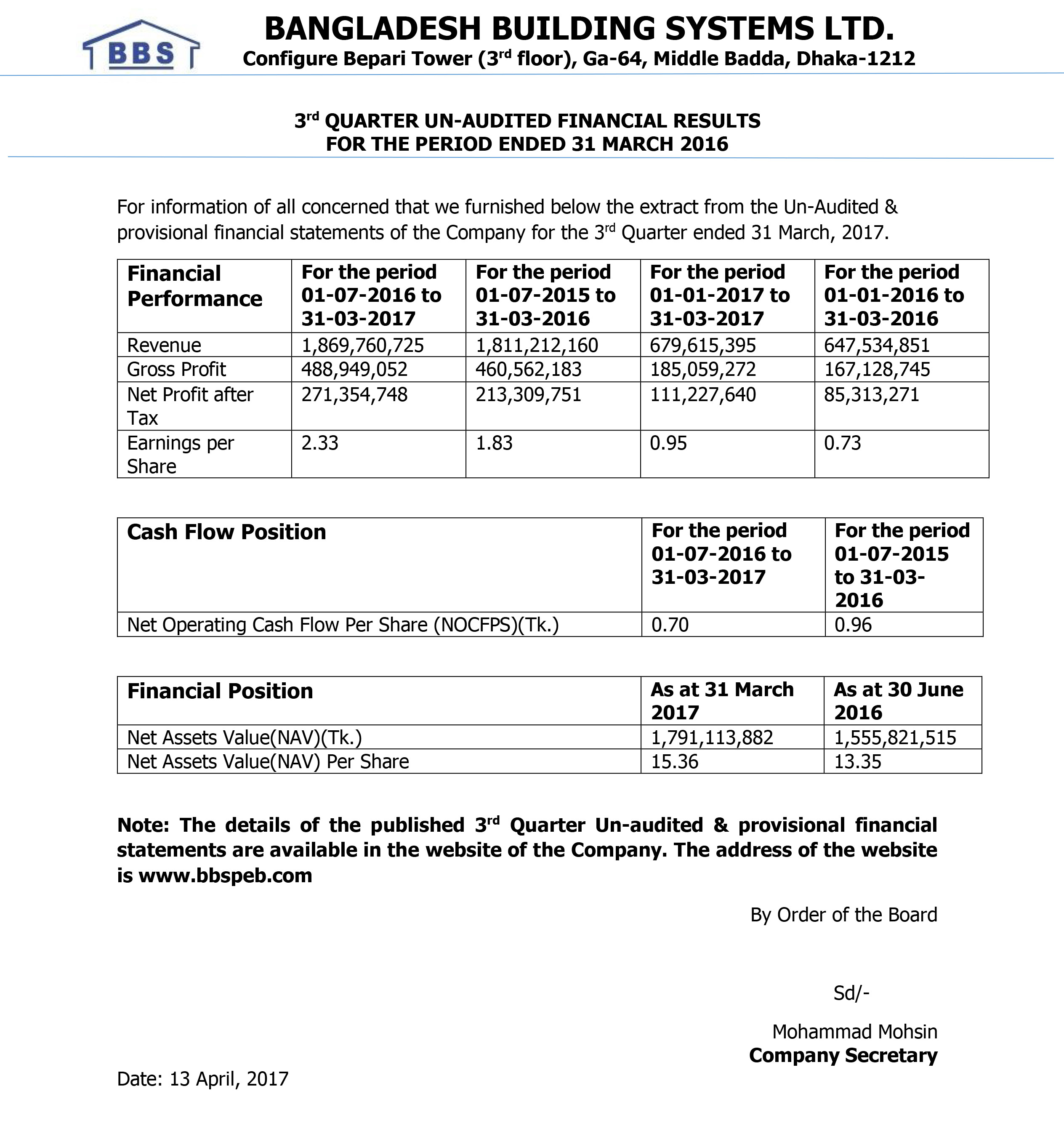 Bangladesh Building Systems Ltd 3Q Financial Report