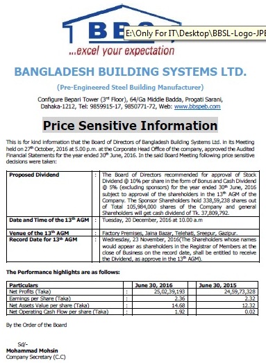 Price Sensitive Information of Bangladesh Building Systems Ltd.