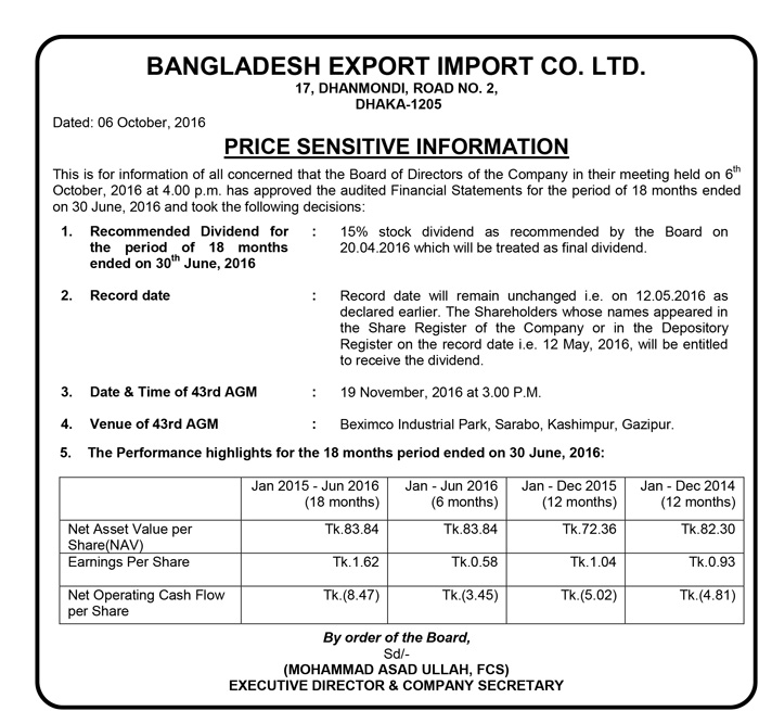 Bangladesh Export Import Company Ltd Price Sensitive Information