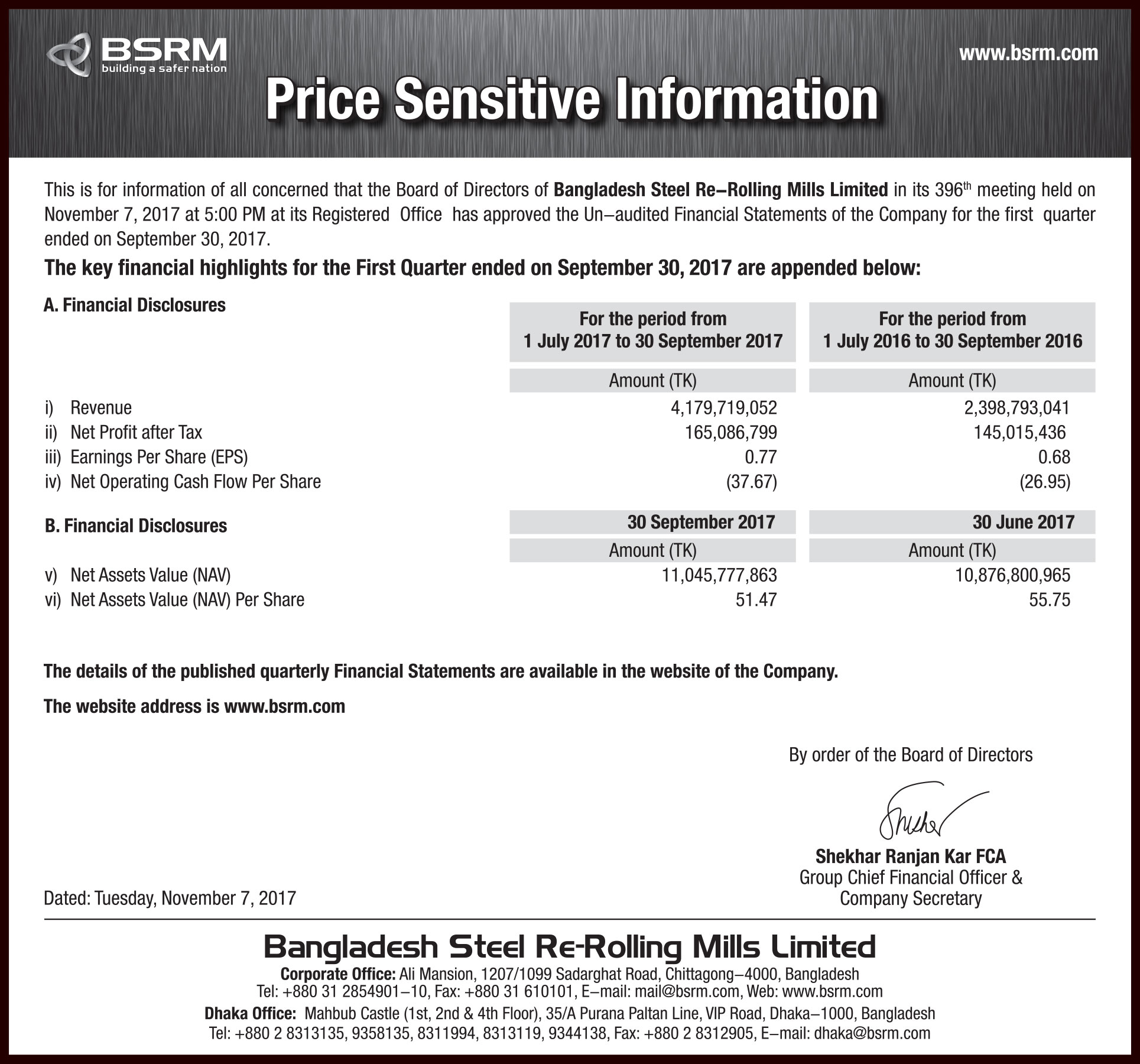 Price Sensitive Information of Bangladesh Steel Re-Rolling Mills Limited