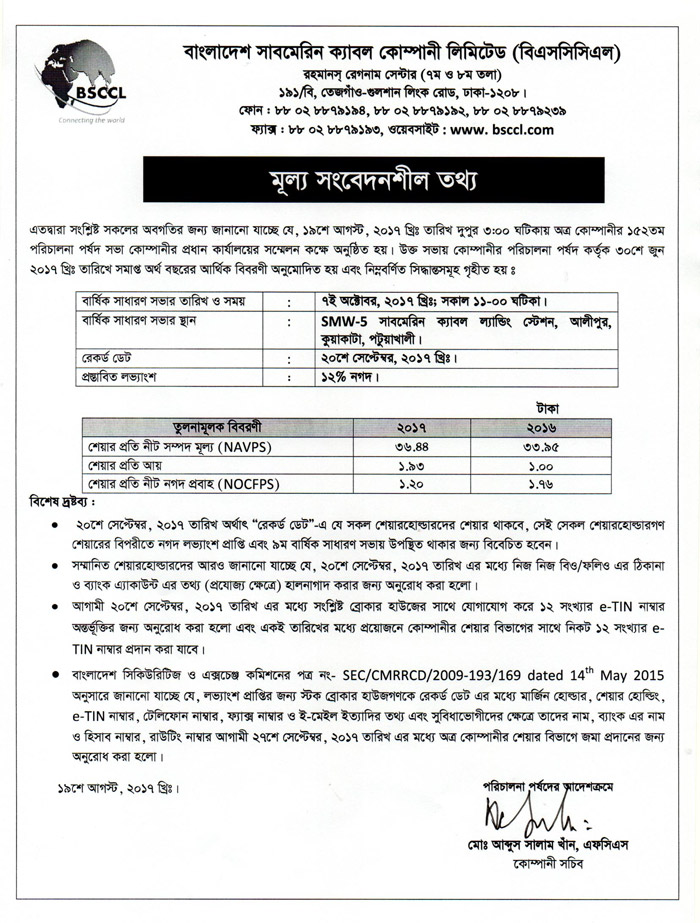 Price Sensitive Information of Bangladesh Submarine Cable Company Limited(BSCCL)