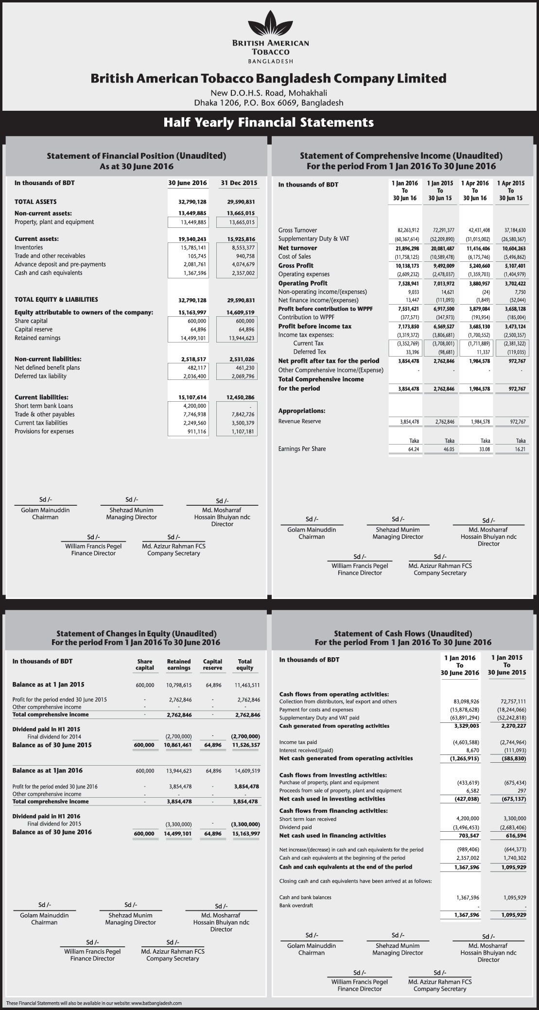 Un-audited Interin Condensed Financial Statements of British American Tobacco Bangladesh
