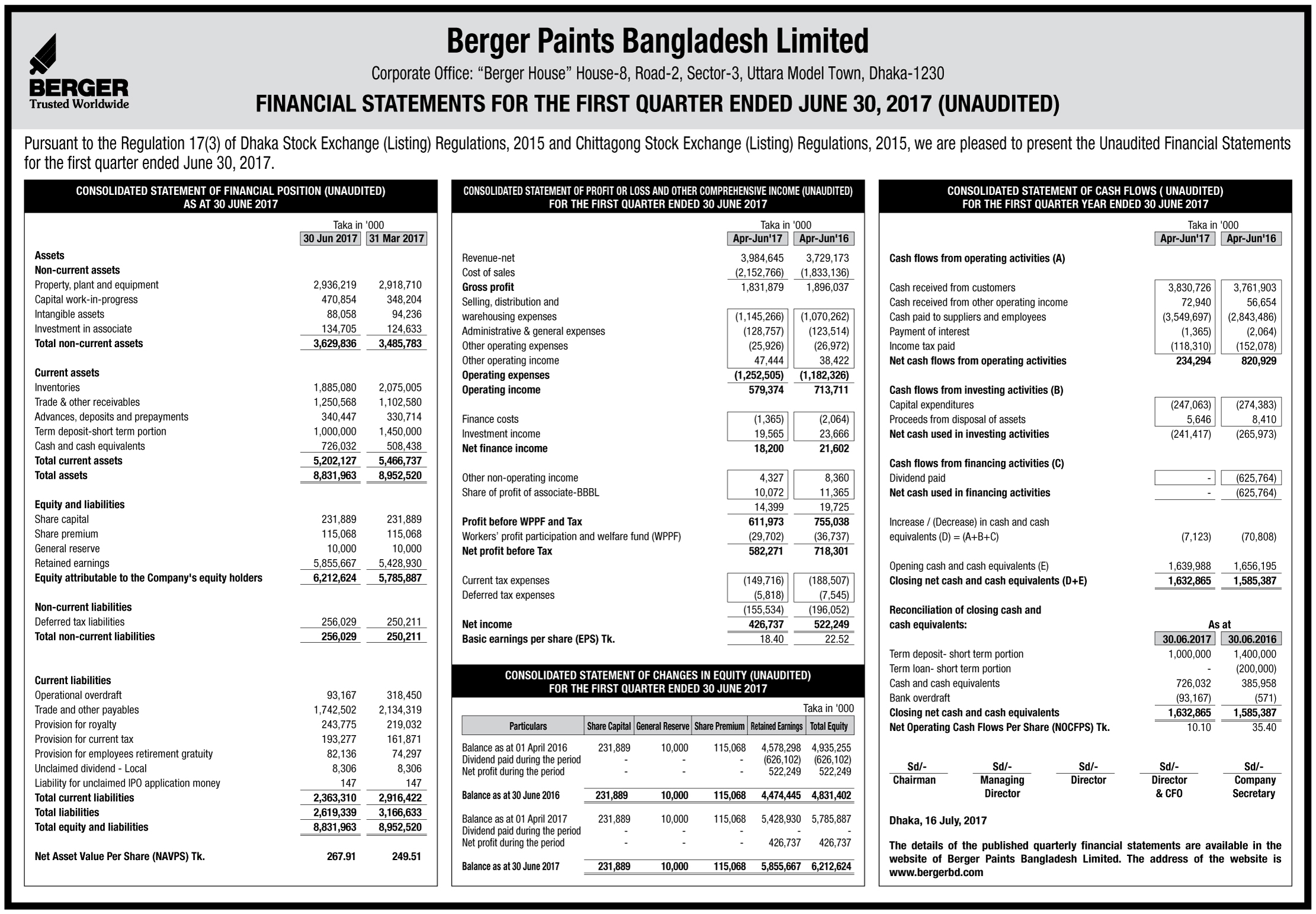 Berger Paints Bangladesh Ltd 1Q Financial Statements