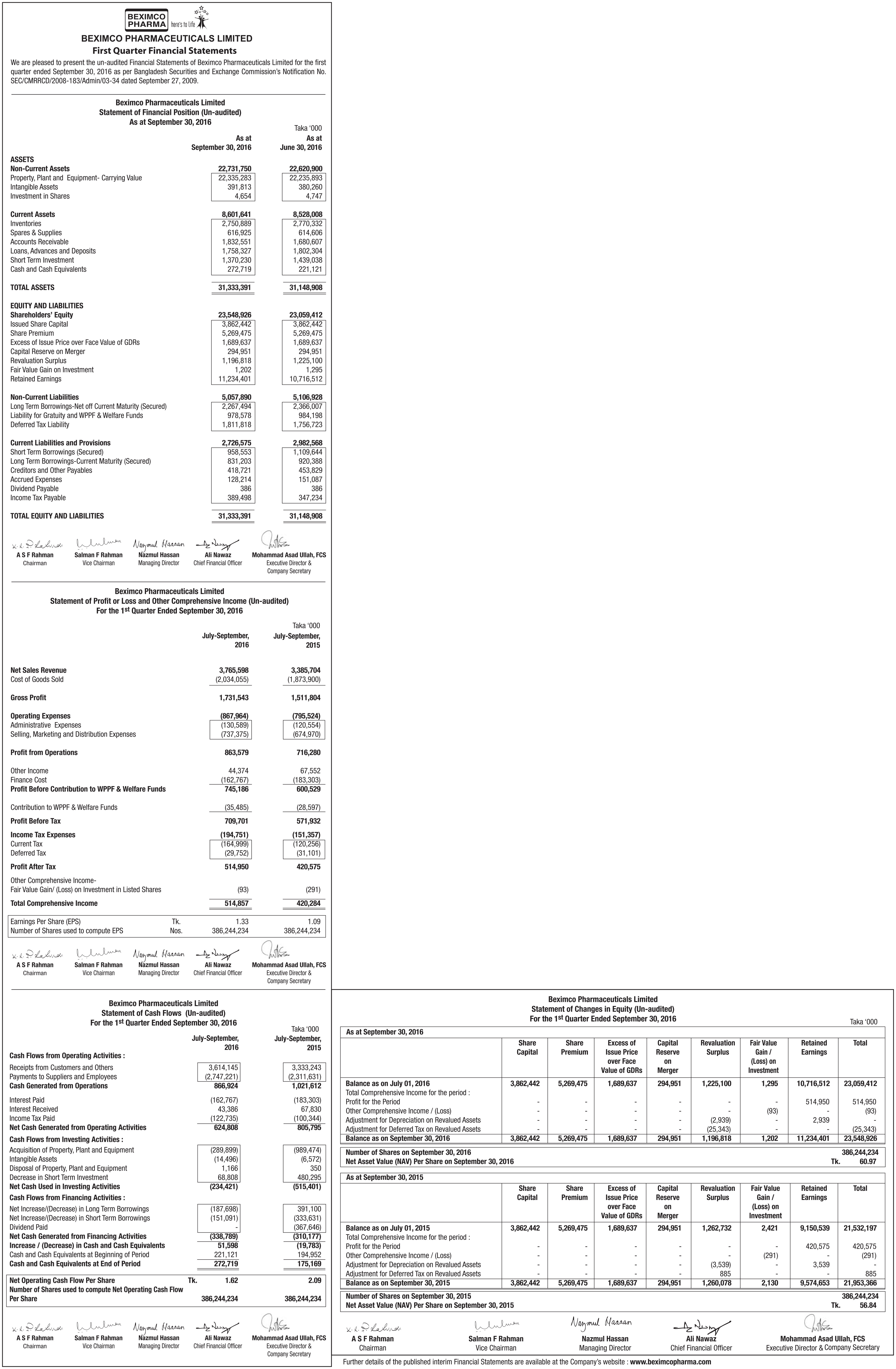 Q1 Financial Statements of Beximco Pharmaceuticals Ltd.