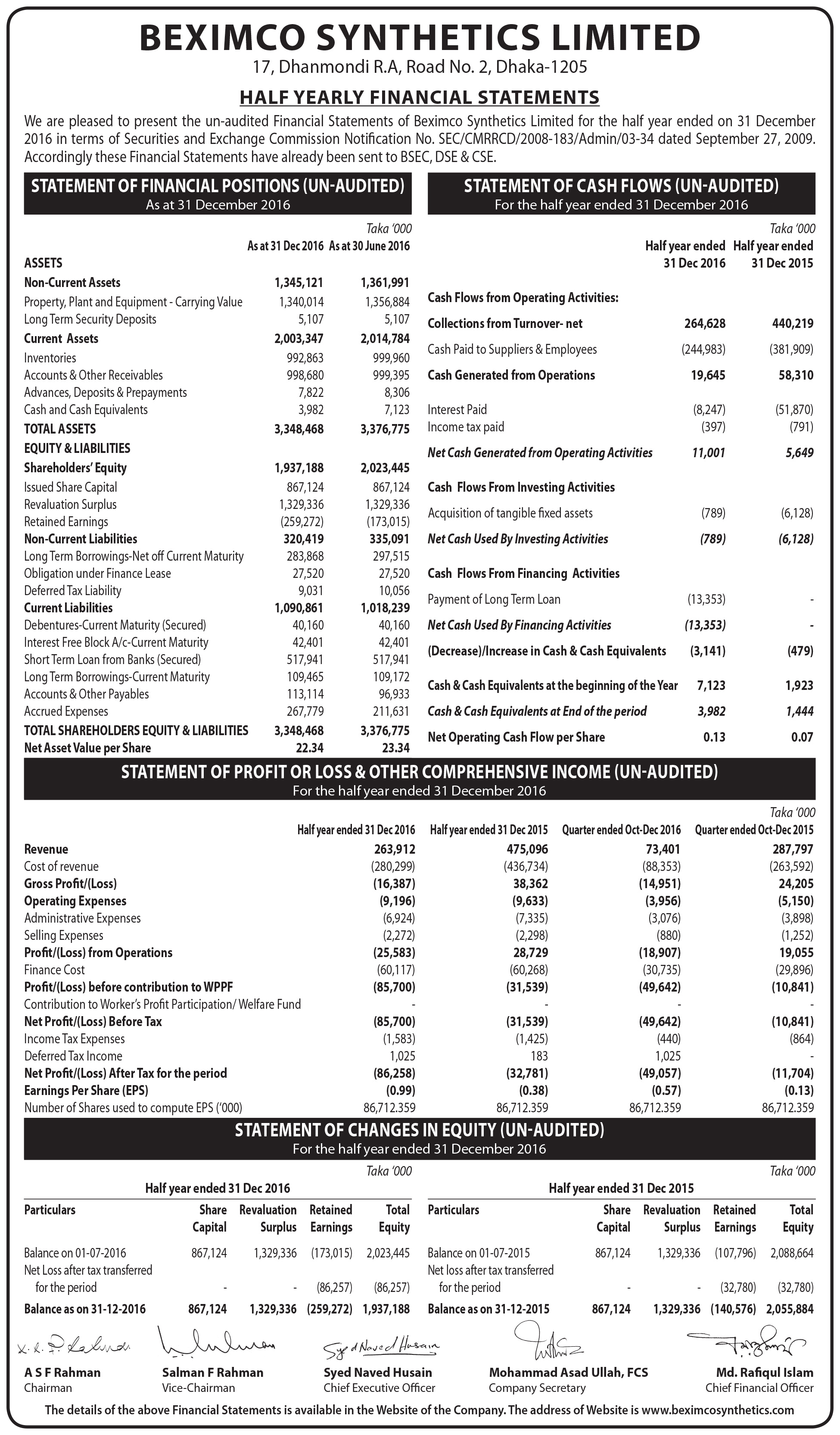 Beximco Synthetics Ltd Half Yearly Financial Statements