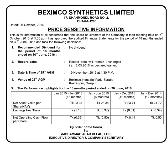 Beximco Synthetics Ltd Half Yearly Financial Statements