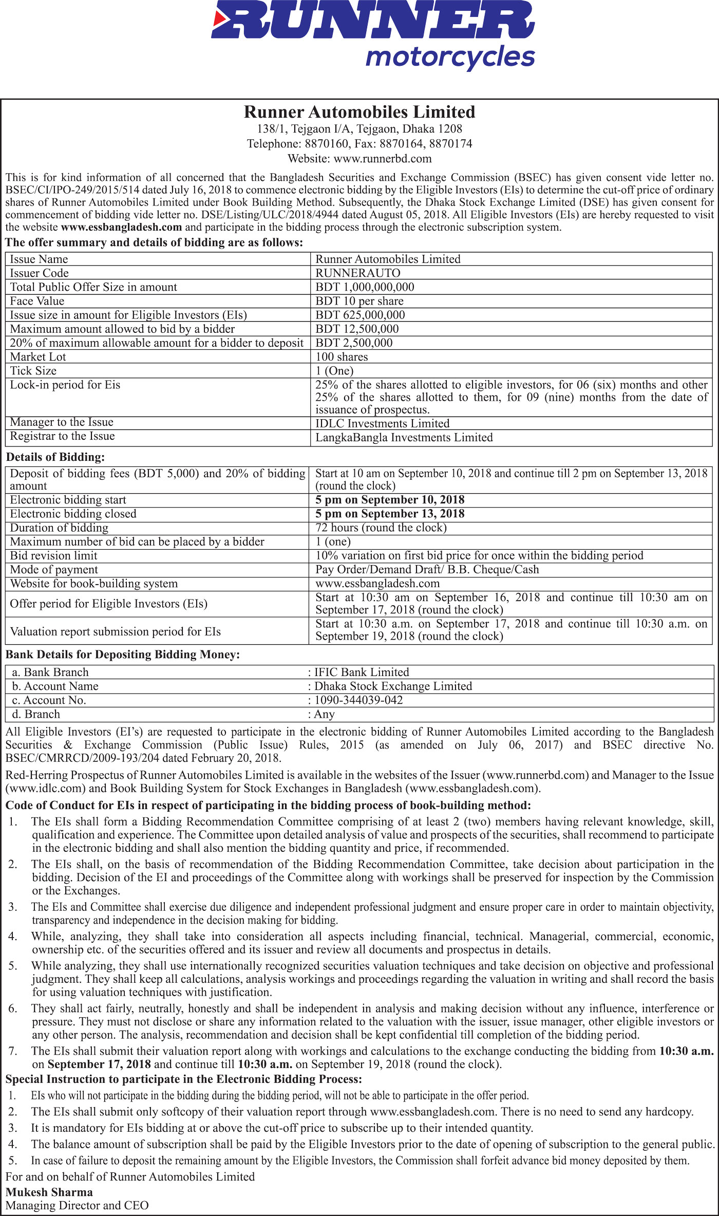 Bidding Process Information of Runner Automobiles Limited Process