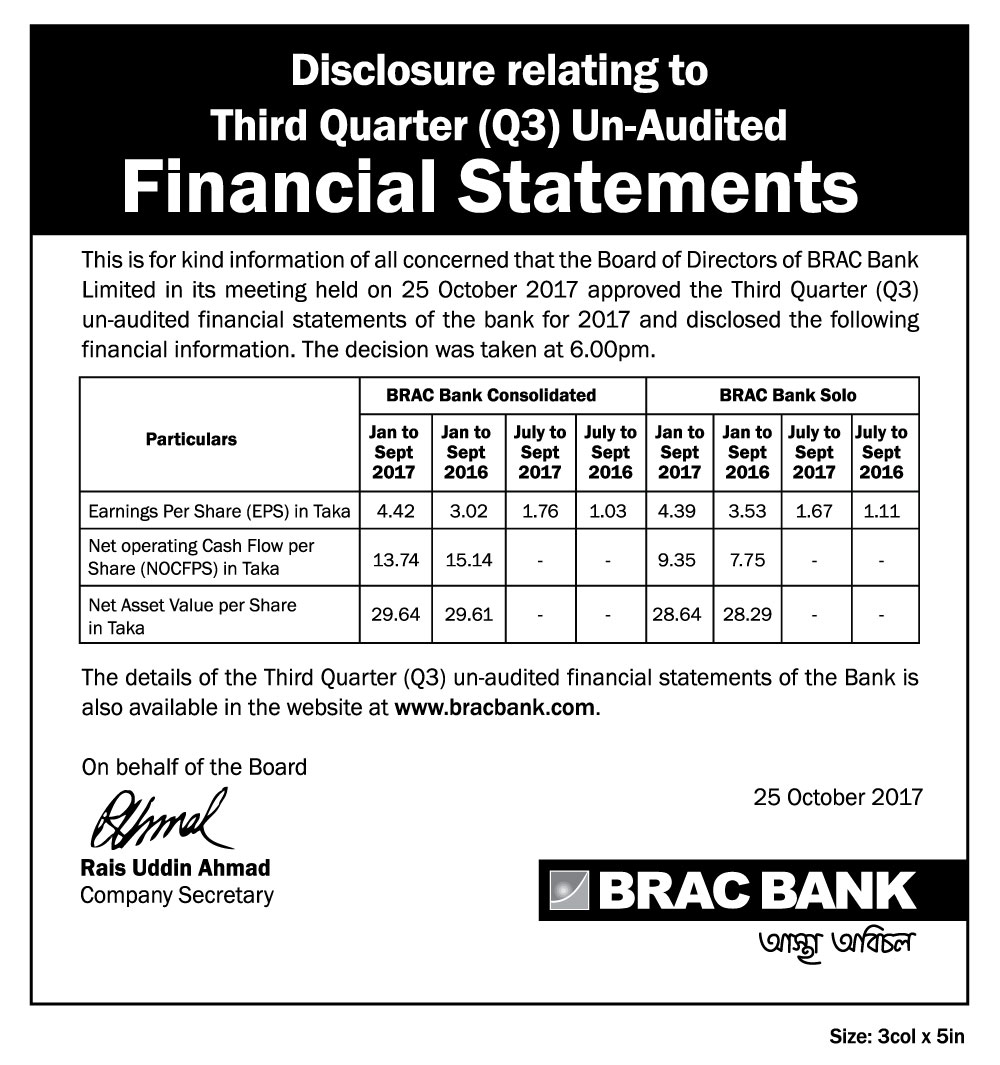 BRAC BANK LTD Q3 FINANCIAL STATEMENTS