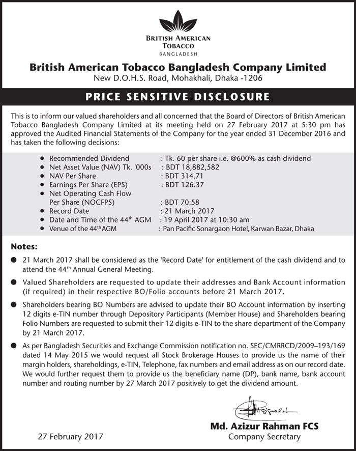 British American Tobacco Bangladesh Company Limited Price Sensitive Disclosure