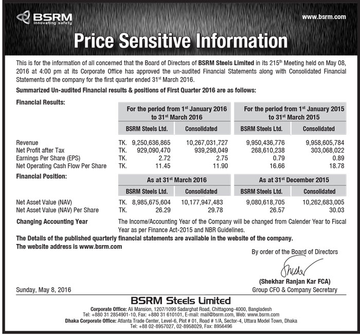 This is for the information of all concerned that the Board of Directors of BSRM Steels Limited in its 215th Meeting held on May 08, 2016 at 4:00 pm at its Corporate Office has approved the un-audited Financial Statements along with Consolidated Financial Statements of the company for the first quarter ended 31st March 2016.