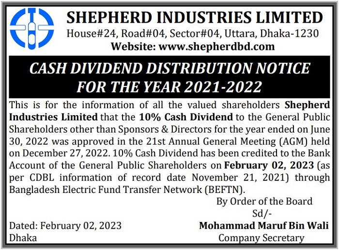 Cash Devidend Distribution Noitce of Shepherd Industries Ltd