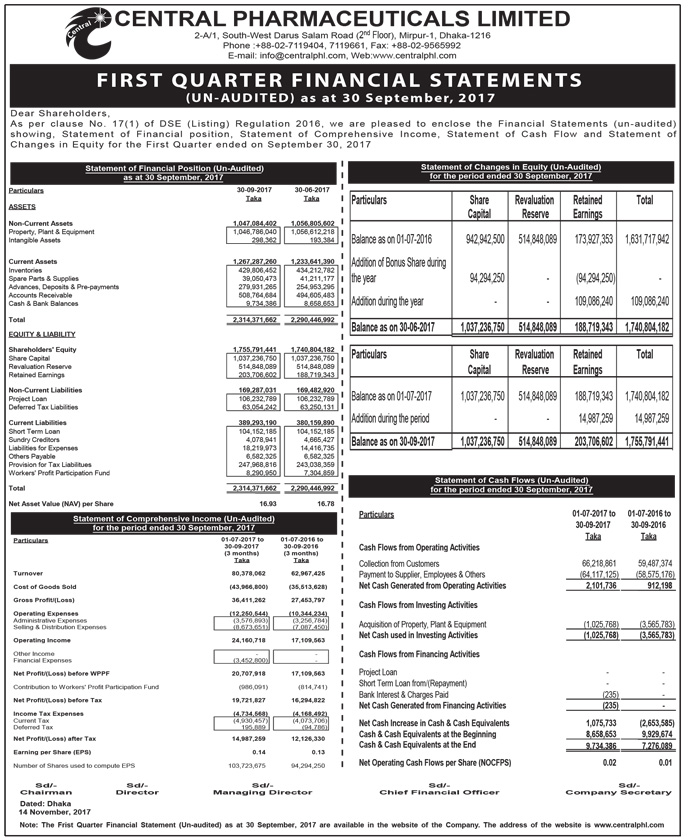 Q1 Un-audited Financial Statements of Central Pharmaceuticals Limited