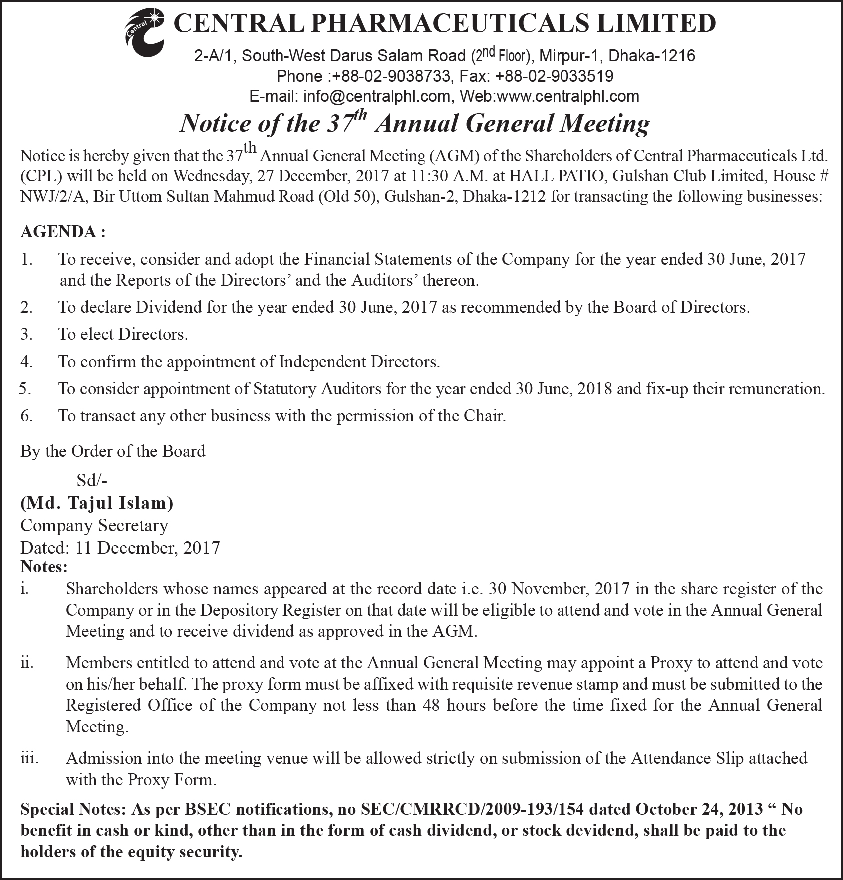 Central Pharmaceuticals Ltd. 37th AGM Notice