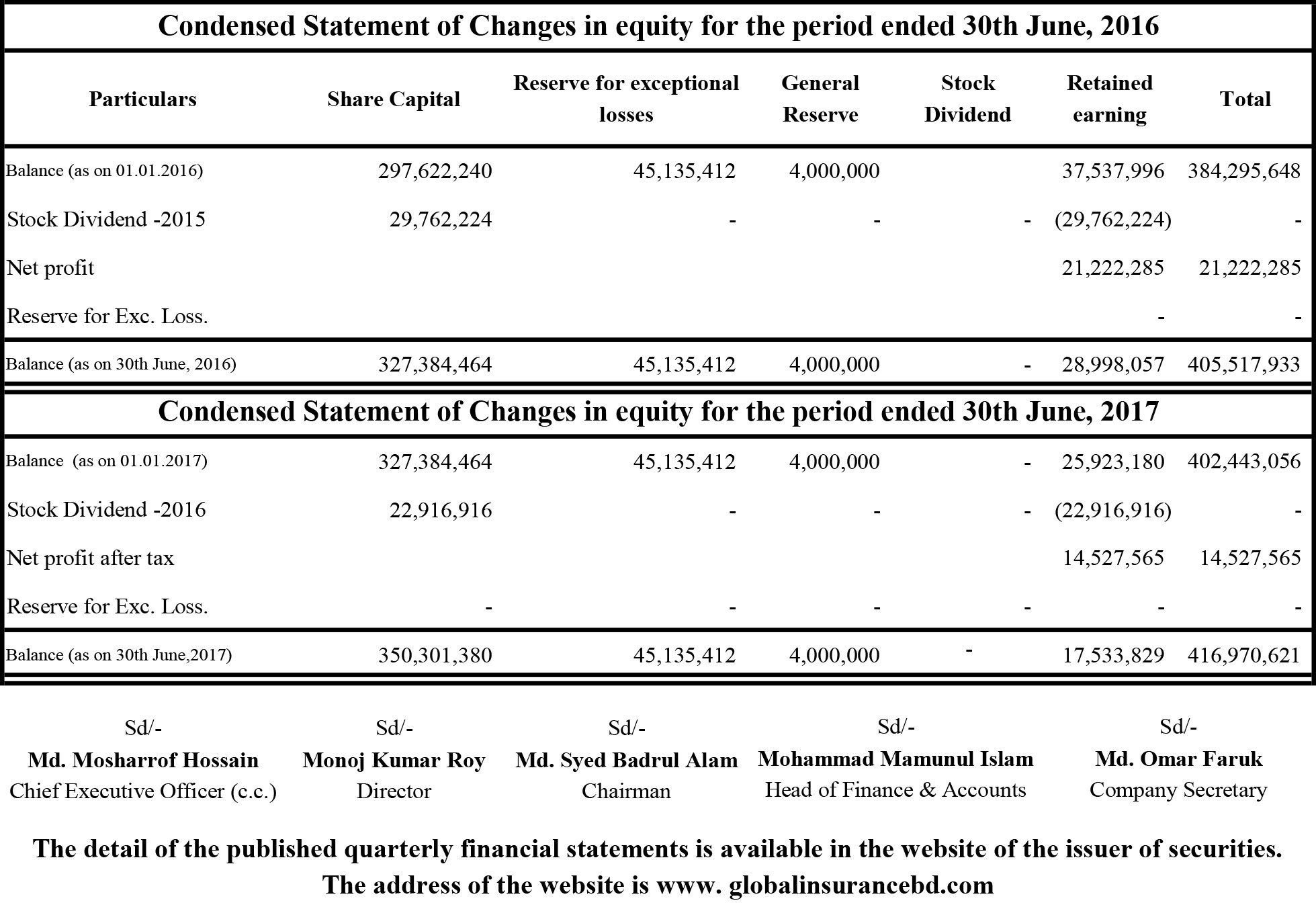 Statements of Financial Position (Un-audited) of Global Insurance Ltd