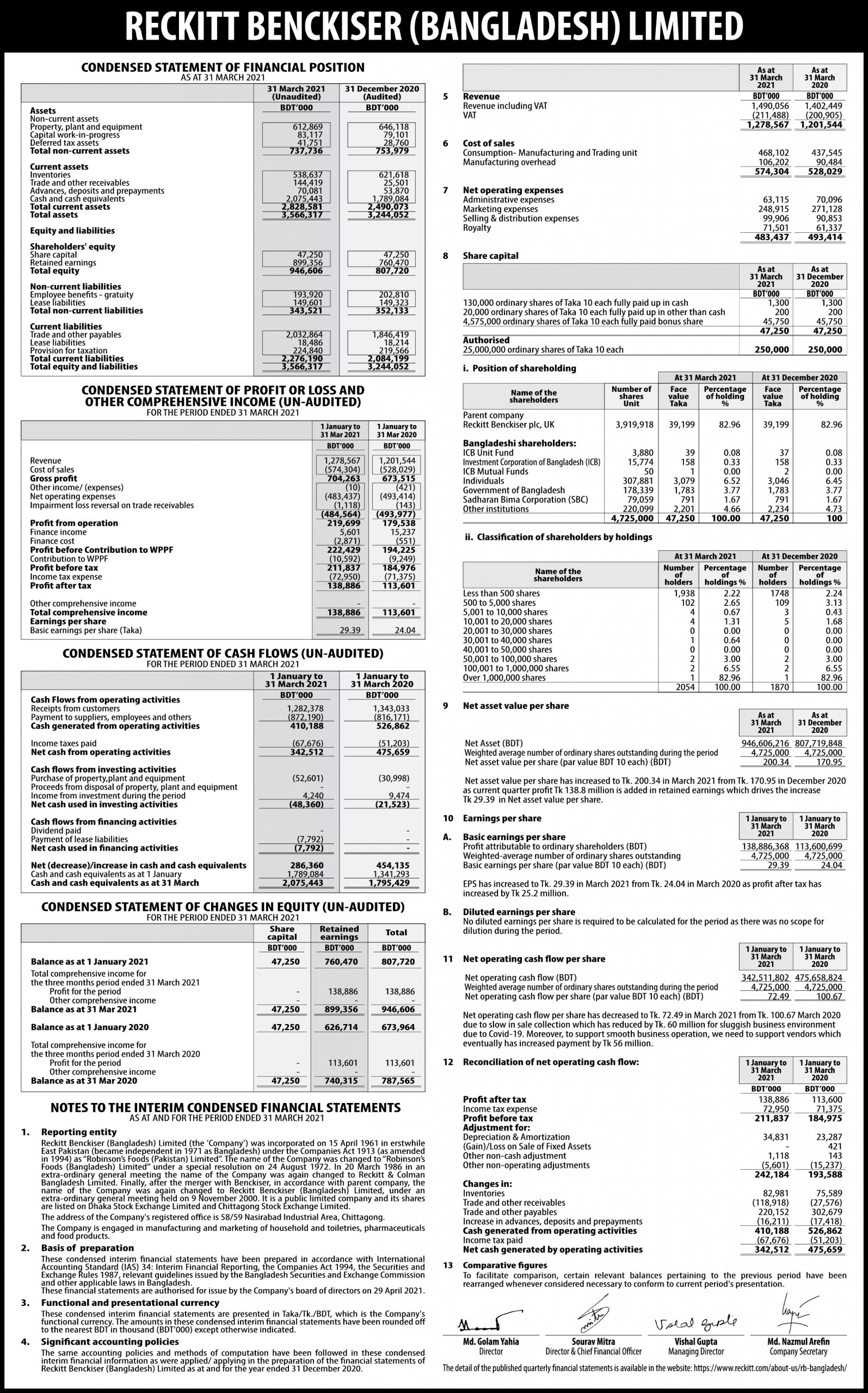 Financial Statements of Reckitt Benckiser(Bangladesh) PLC