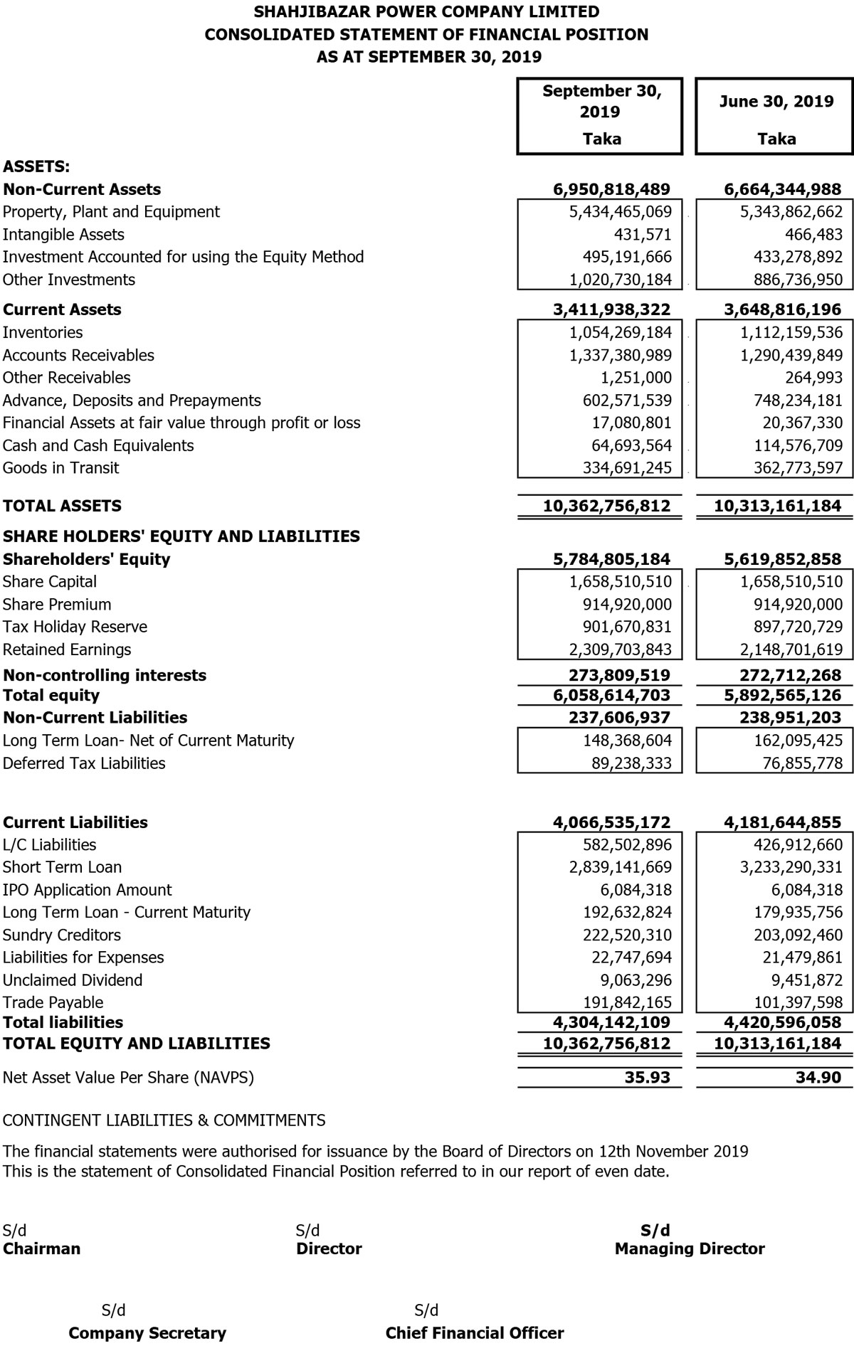 Consolidated Financial Position of Shahjibazar Power Co. Ltd