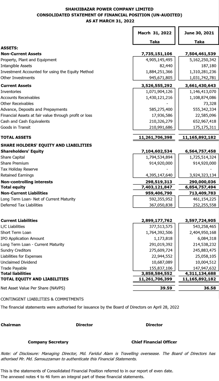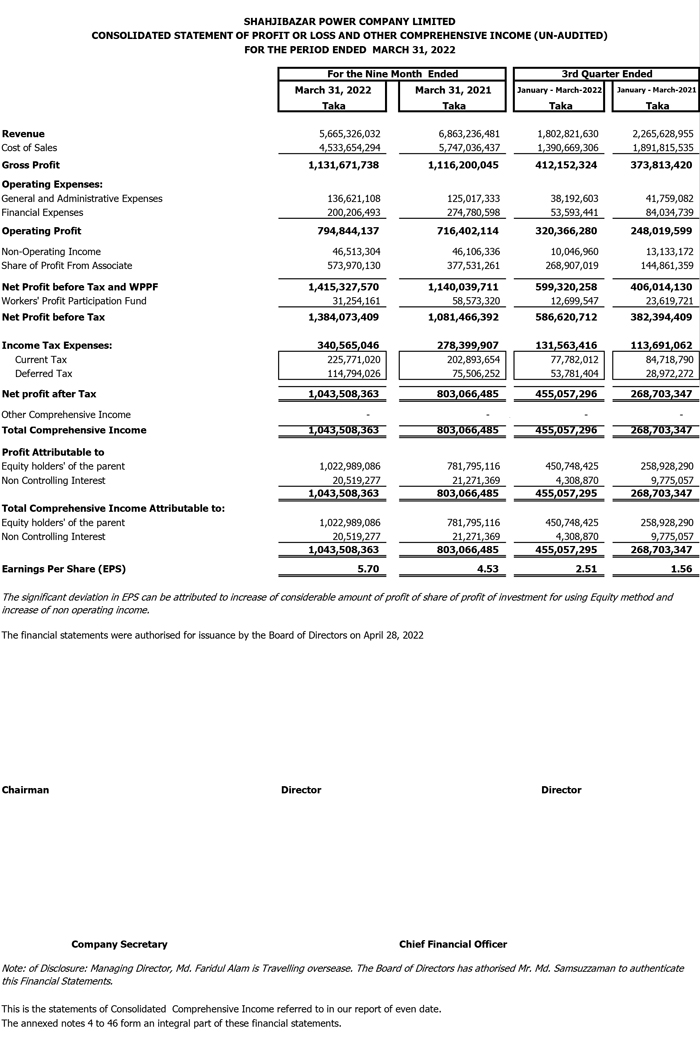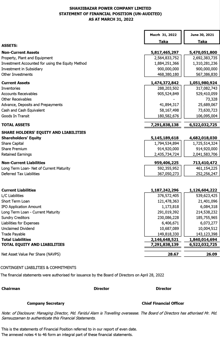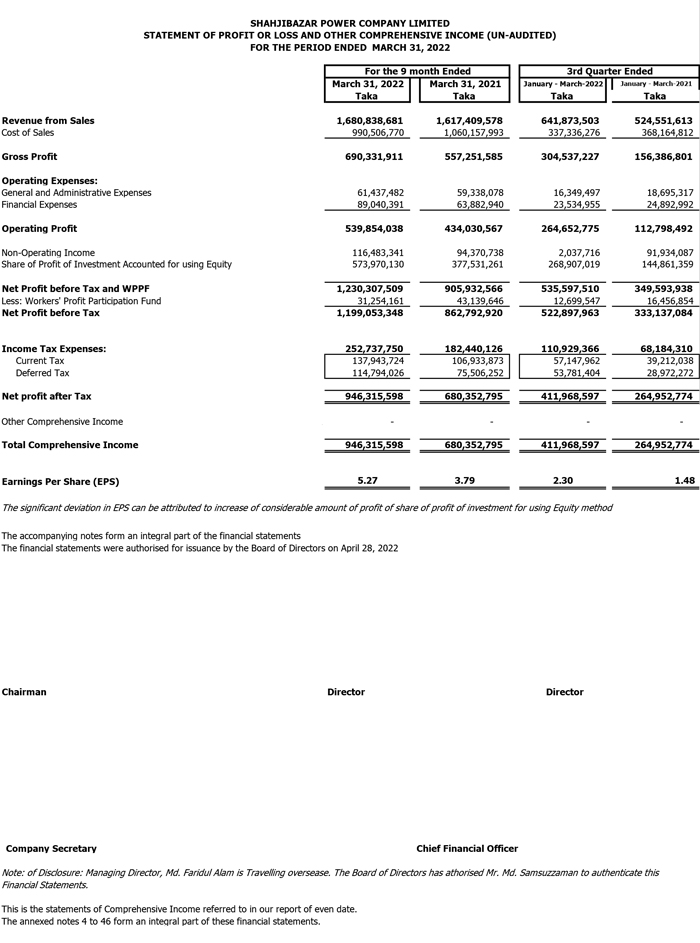 Q3 Un-audited Financial Statements of Shahjibazar Power Co. Ltd