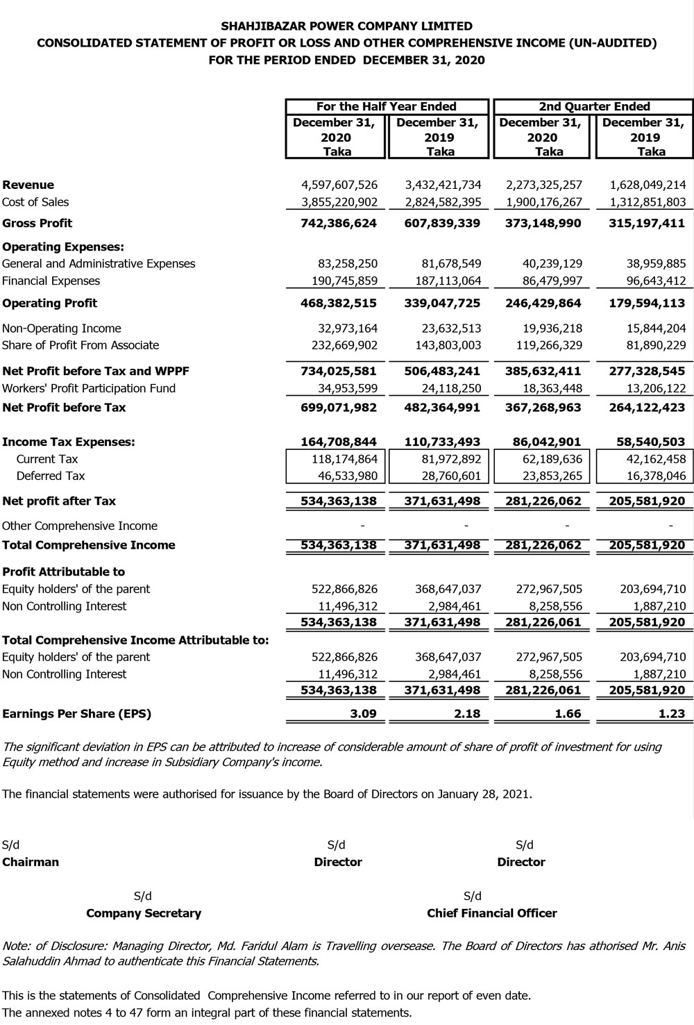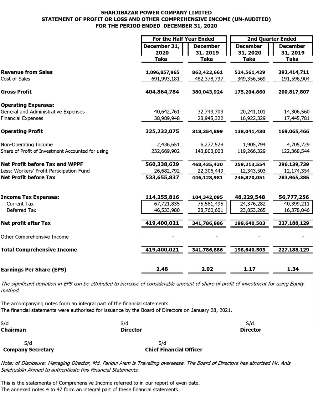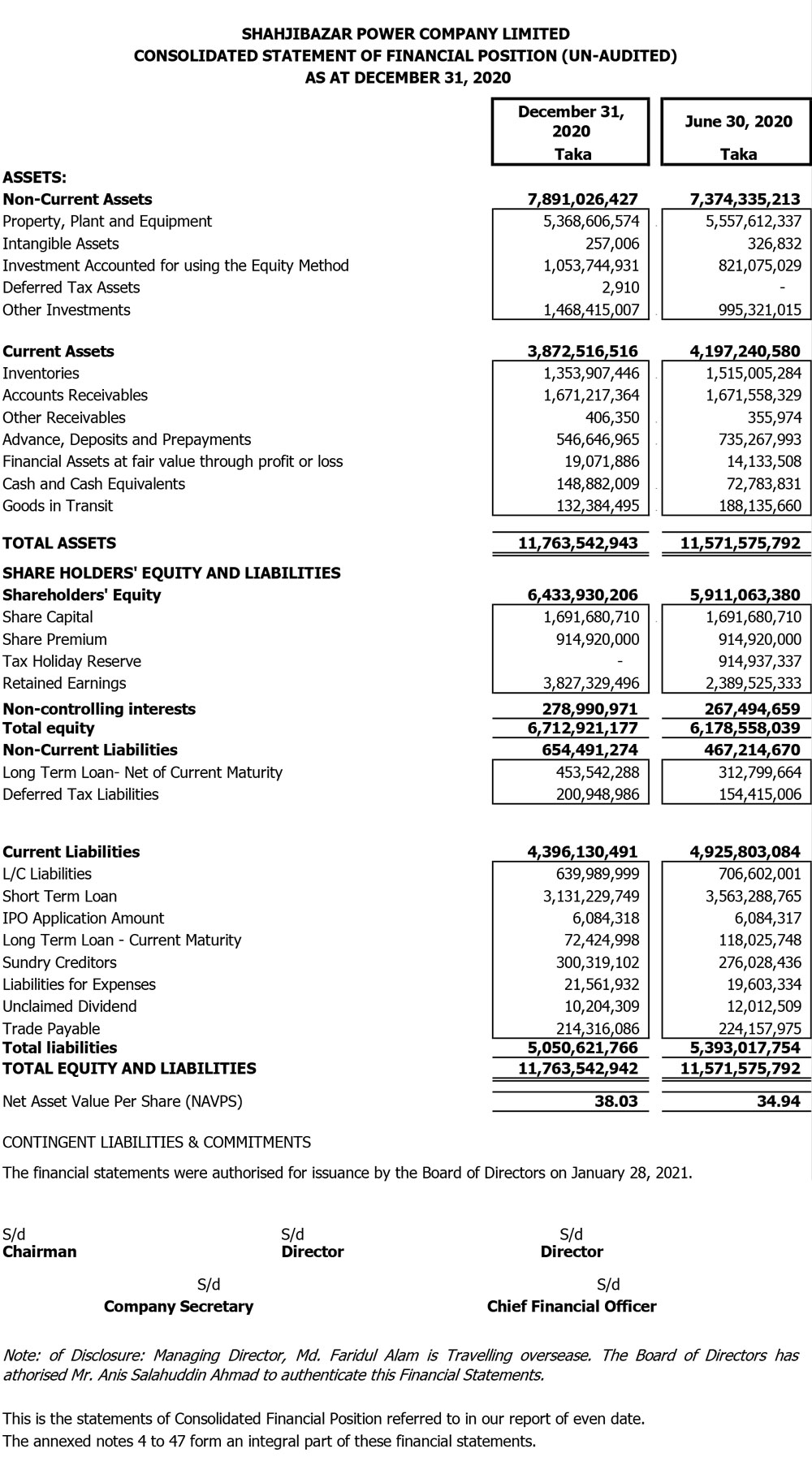 Q2 Un-audited Financial Statements of Shahjibazar Power Co. Ltd